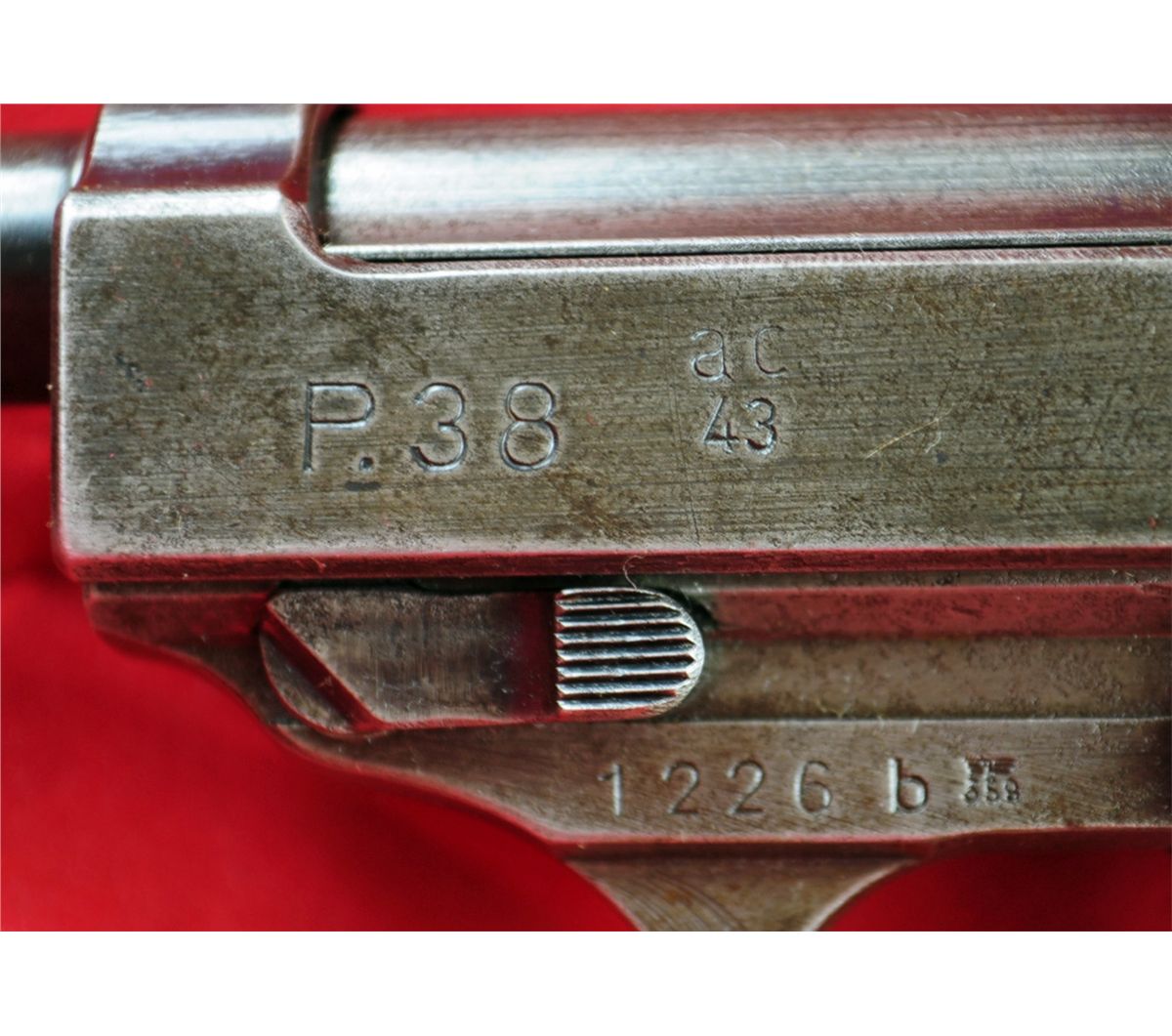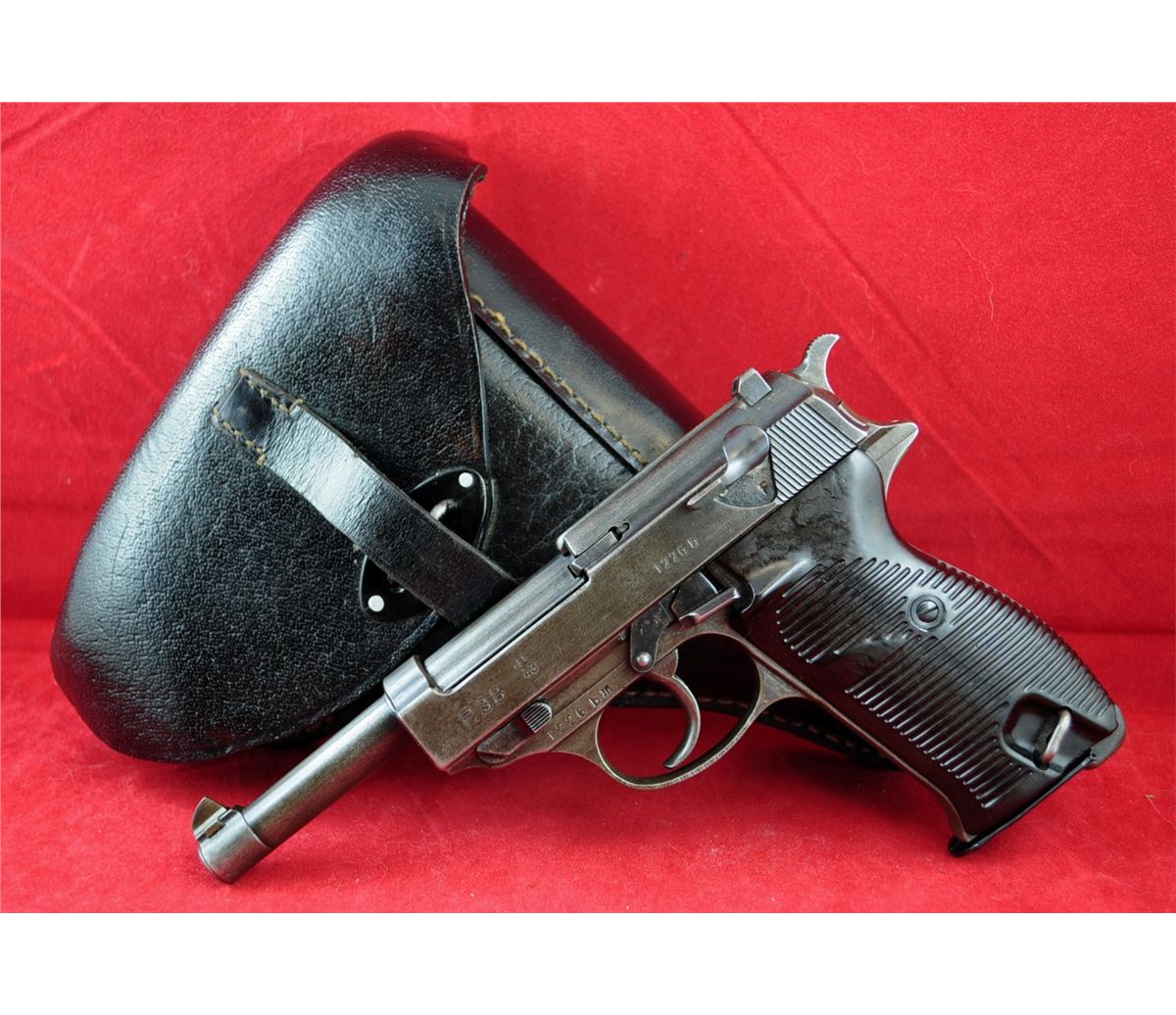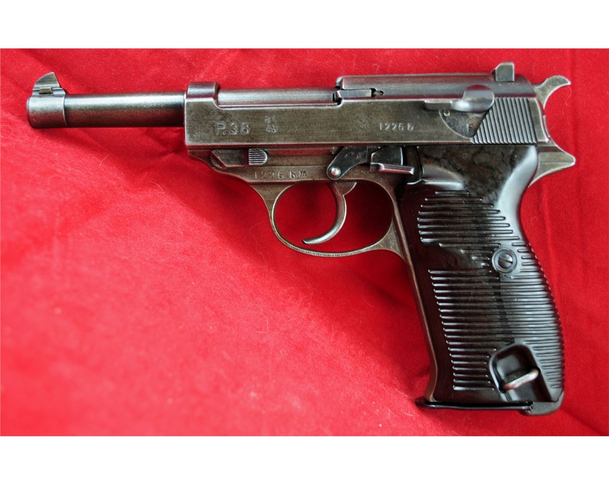 Walther P38 AC- 43 WWII Nazi Semi-Auto 9mm, Ser.#1226B, With Original P-38 Natzi Leather Holster. Pistol and holster are in good condition..See photos for more information. See photos for more information.Kennedys Auction Service has not attempted to test fire any gun in this auction and all guns are sold "IN AS IS CONDITION" and are not guaranteed to be operational.