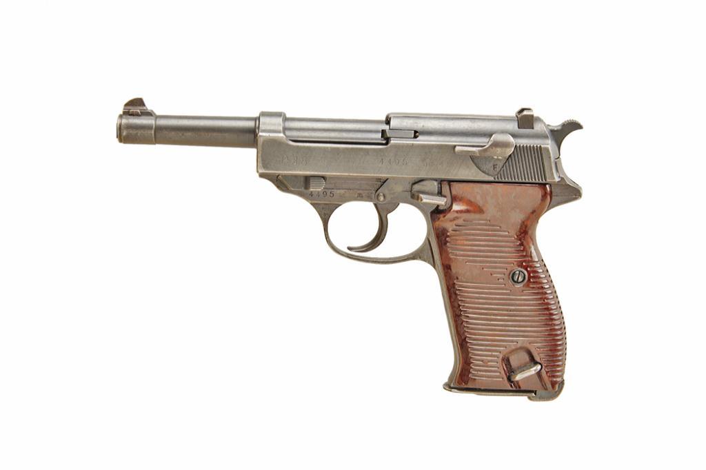 Walther P38 Cal 9mm SN:4495 Double action semi-auto military pistol "ac45" version with single eagle over 359 on the frame. Military blued finish, brown plastic grooved grips, 5" barrel, drift adjustable rear sight, good bore and action. Condition: VDouble action semi-auto military pistol "ac45" version with single eagle over 359 on the frame. Military blued finish, brown plastic grooved grips, 5" barrel, drift adjustable rear sight, good bore and action. Condition: Very good showing high point edge wear and some use. Stampings all clear and readable. All matching numbers except magazine.