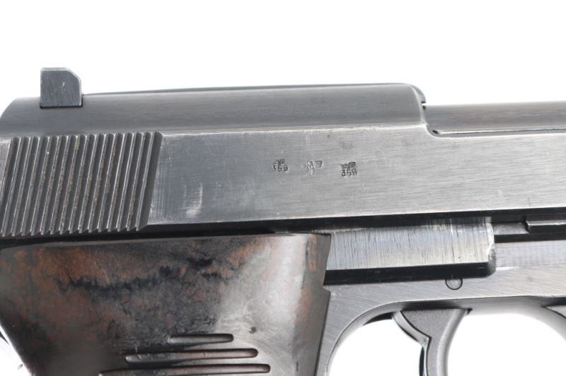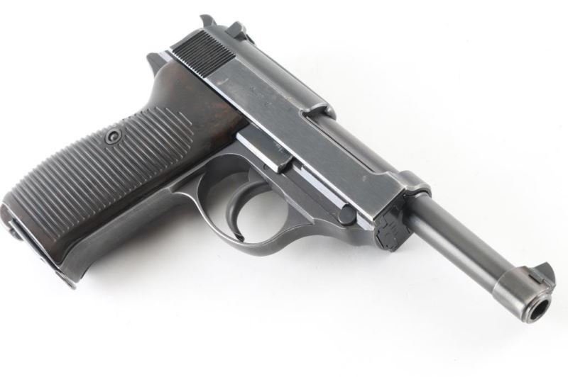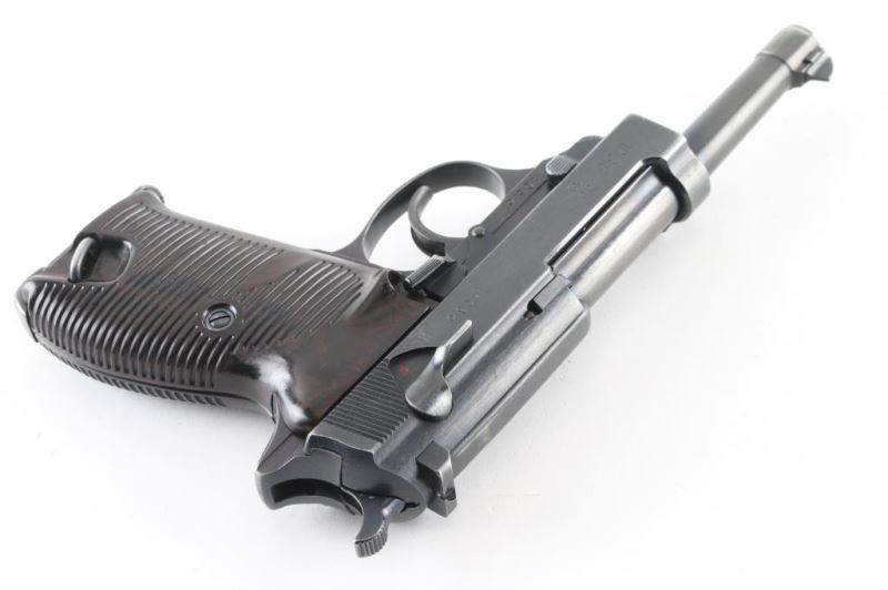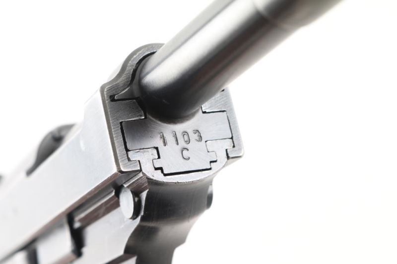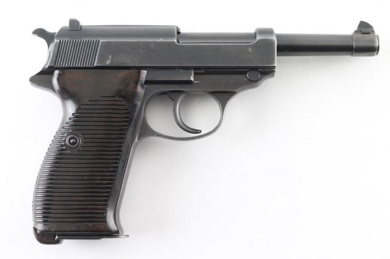 Pistol. Semi-Automatic. 8 rd Magazine. Third Reich era military issued sidearm. 4.9" barrel. Short recoil, hinged locking piece assisted breechblock. Matching serial number on magazine. ac 42 Matching serial numbers including the locking block. Waffenamts, Eagle/359. All stampings are crisp/clear. Bore appears excellent/bright. Bakelite grips excellent. Blued finish is about 92% with some very minor scratches, muzzle wear, and some tracking on barrel. There is some handling loss on the fore strap. Original magazine with waffenamt' and "P.38". "1103c is stamped on the floor plate. Nice conditioned early Walther. Extremely rare to find matching magazine. NRA Condition-Very Good. C&R firearm