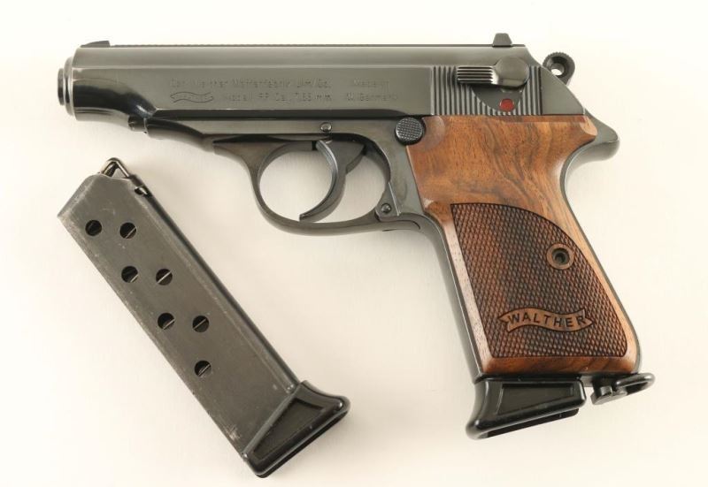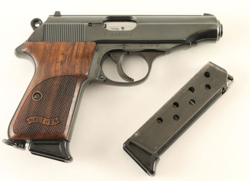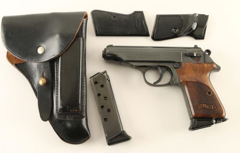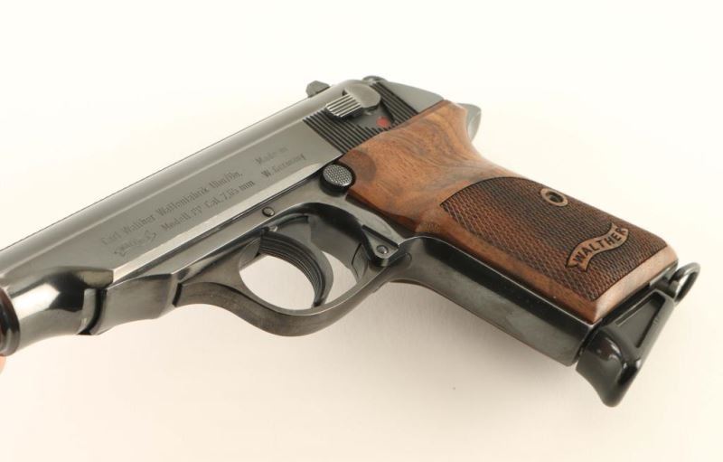 West Germany produced double action semi-automatic compact pistol chambered in 7,65mm, circa 1975. Imported by Classic Distributors Inc. of Swanton, V.T. with small import marks on the right side of the frame. Features all steel construction, a blued finish, 3.9" barrel, fixed front sight w/ white dot, dovetailed rear window sight, serrated round hammer spur, thumb safety/decocker, loaded chamber indicator, lanyard ring, serrated trigger, push button magazine release, 8 round factory magazine w/ finger rest floorplate, and custom two-piece finely checkered wood grips w/ Walther banners. Includes an unmarked smooth black leather flap holster with spare magazine and the original black plastic grips. Pistol exhibits approximately 97% of it's original blued finish showing minor holster wear, minimal handling marks and light wear on the hammer & frame from firing. Action is crisp, bore is pristine and wood grips are fine. Condition is NRA excellent. ***Modern Firearm***