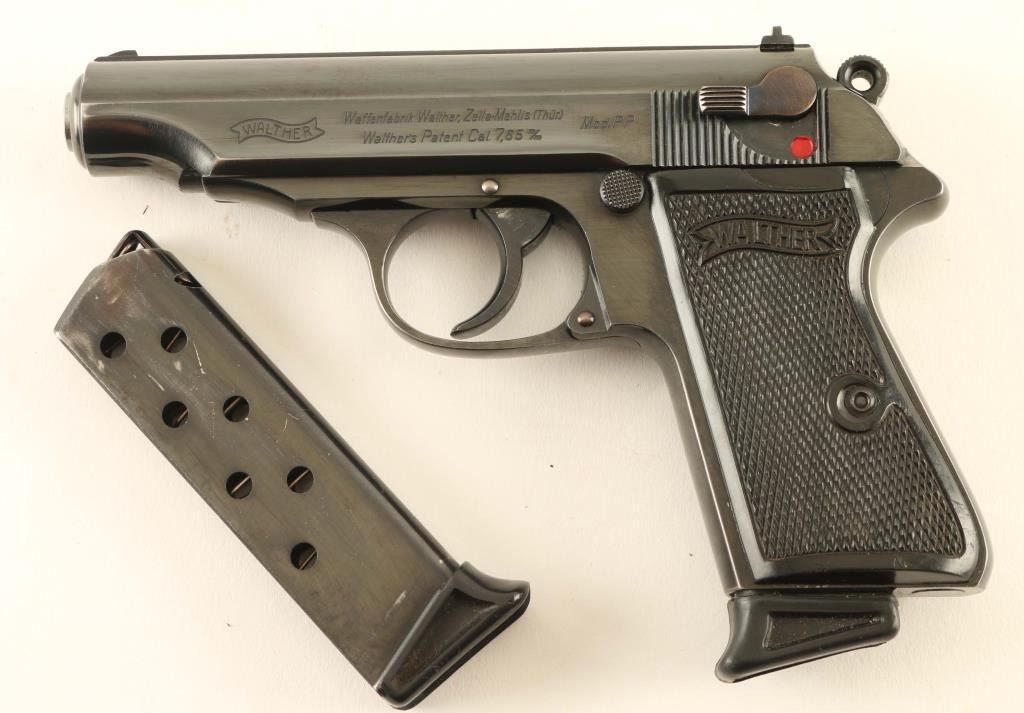 German semiautomatic pistol features approx 3.7" barrel, fixed sights, single/double action, decocking safety, detachable magazine. Bore is very good to excellent. Retains 85% bright blue with bare metal showing on edges of slide, frame, lower backstrap. Black plastic grips in very good condition. Serial number indicates production circa 1934. Crown N proofs on slide & barrel. Attributed as a WWII US Veteran bring-back (no papers). No import marks observed. Includes a total of two Walther marked magazines with finger rests. Condition is NRA Very Good *** C&R Firearm ***