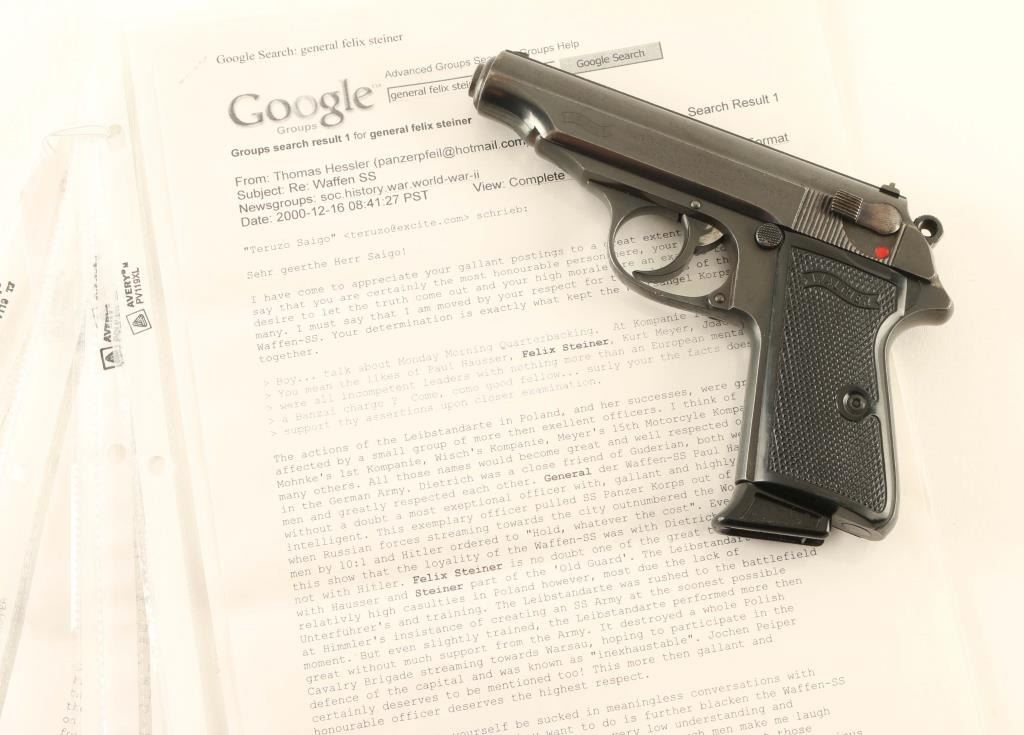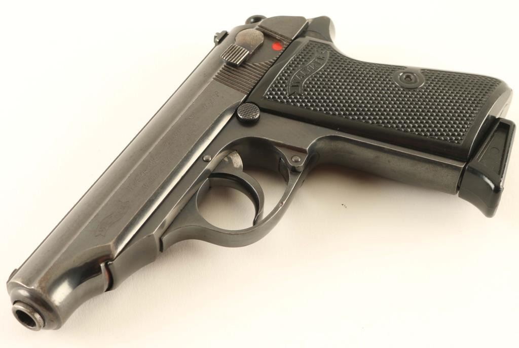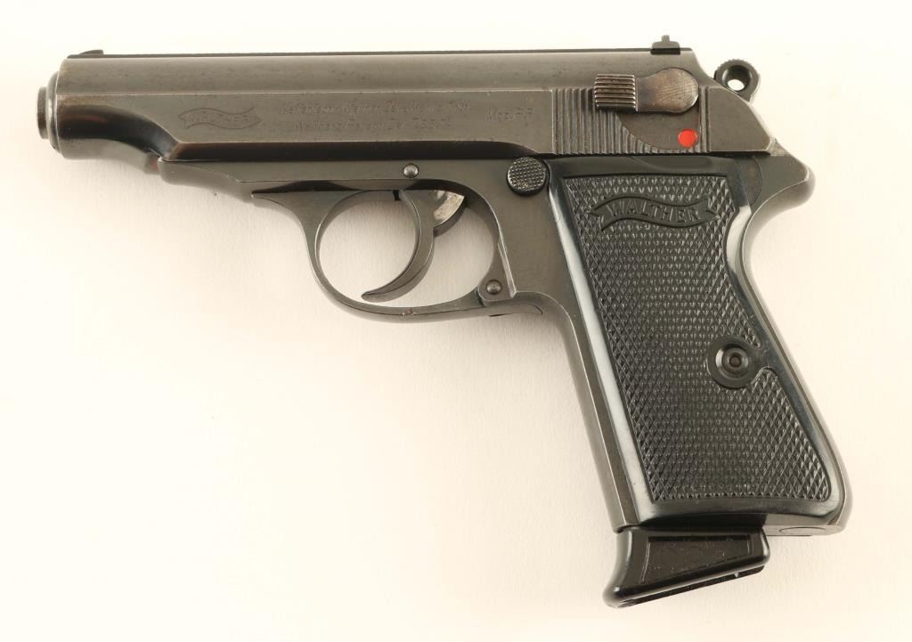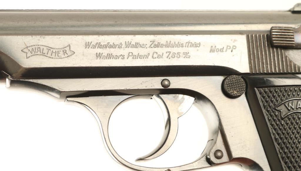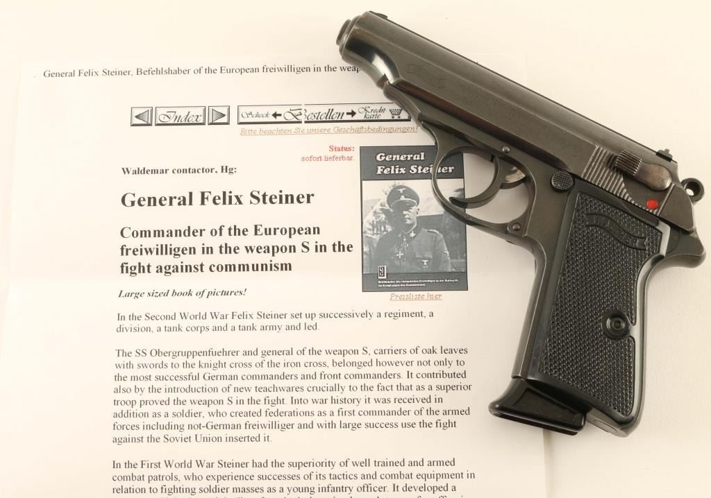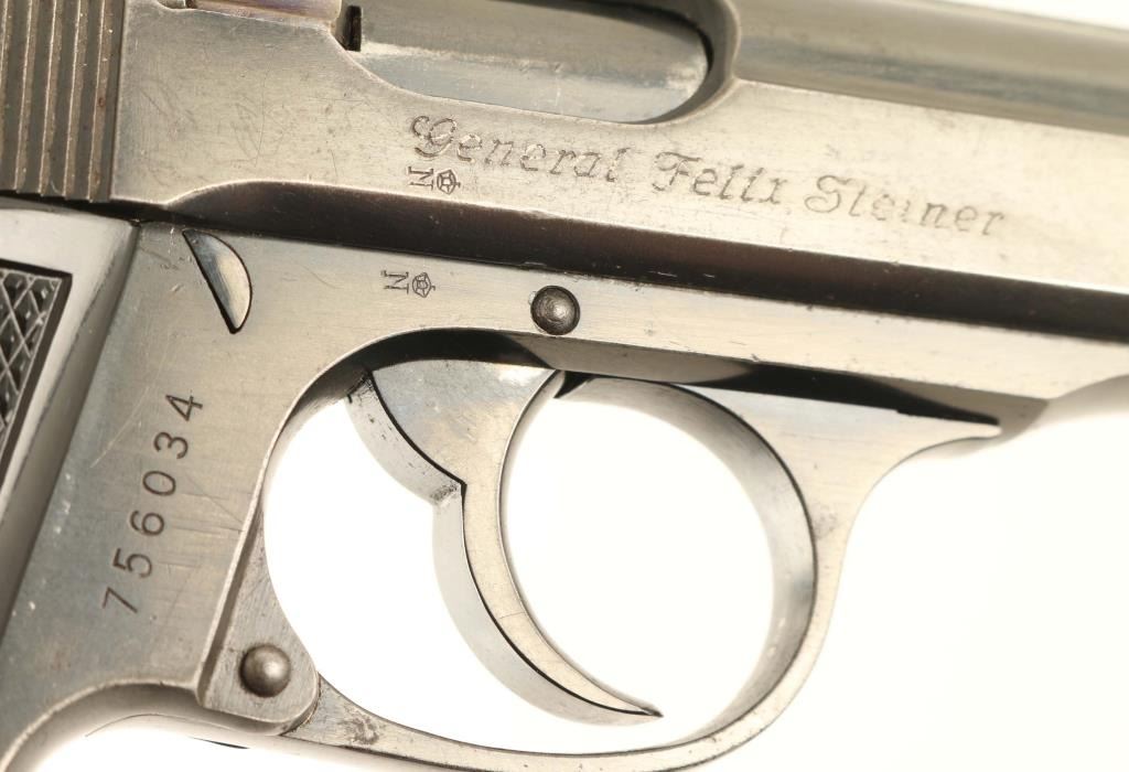 Inscribed double action semi-automatic compact pistol chambered in 7.65mm Browning, manufactured in Zella-Mehlis, Thuringen, Germany circa 1930. The right side of the slide is period engraved “General Felix Steiner”. Steiner was a highly decorated SS Commander during the Nazi era. He was awarded the The Knight's Cross of the Iron Cross with Oak Leaves and Swords, and commanded (at varying times) the Verfügungstruppe SS Regiment Deutschland, SS Division Wiking, III SS Panzer Corps, and 11th SS Panzer Army. Pistol features a blued finish, 3.9" fixed barrel, fixed blade front sight, dovetailed rear sight with ‘u’ notch, smooth trigger, serrated round hammer spur, manual safety on the left side of the slide, loaded chamber indicator, push button magazine release, factory 8 round magazine with black synthetic finger rest floorplate, and two-piece checkered black synthetic grips with molded Walther banners. The frame & slide are stamped with [crown]/”N” proofs. Pistol retains approximately 80% of its original blued finish showing holster wear, thinning, and minor pin prick pitting. Action is crisp, the bore is excellent, markings are sharp and the synthetic grips are near fine. Condition is NRA Very Good. ***C&R Firearm***