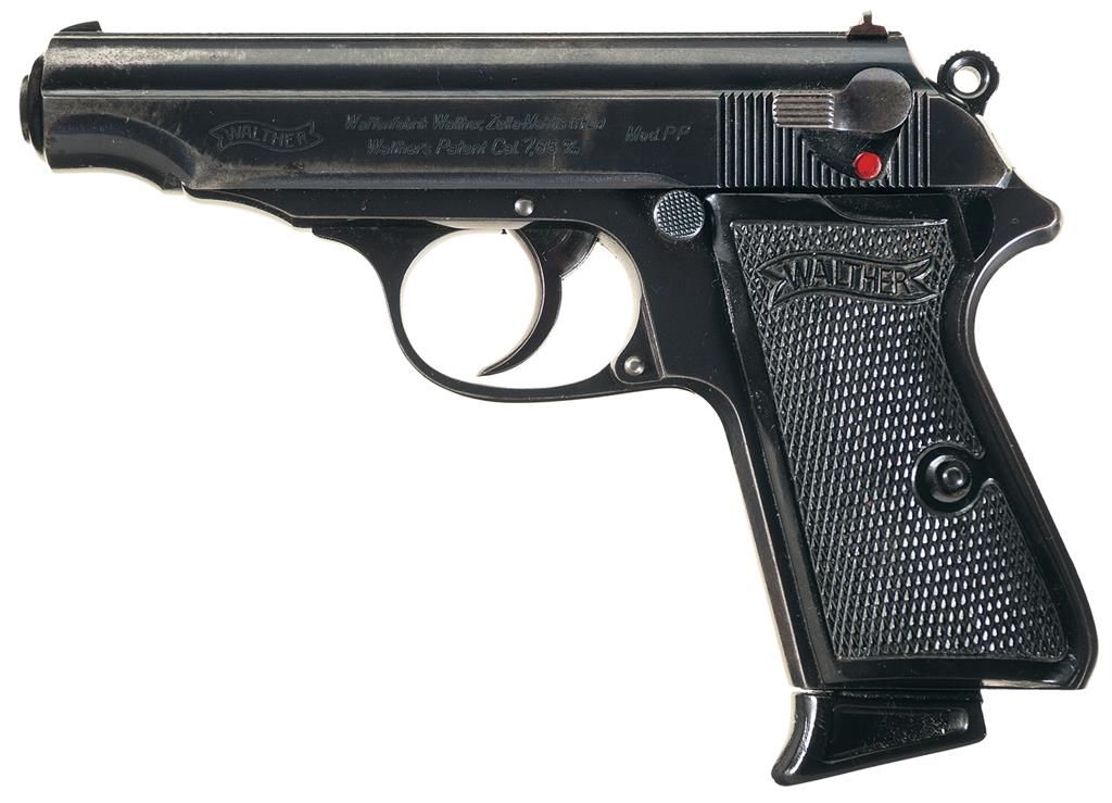 Fixed sights, with the standard Walther markings on the left side of the slide, "Crown/N" proofs on the right side of the chamber, muzzle and slide, and matching numbers on the right side of the frame and inside the slide. The front strap is marked "R.B.D. Munster (Westf.)" indicating it as the property of the Reichsbahndirektionen (Reich Railway Division) responsible for the city of Munster in the state of Westphalia. Checkered black plastic grips with Walther banners, and matching colored extension on the magazine. With a black leather flap holster marked "D.R.G.M" over the "crossed rifles/A.K." mark on the inner flap and "D.R./winged train wheel" inside.