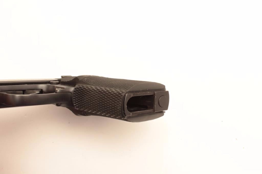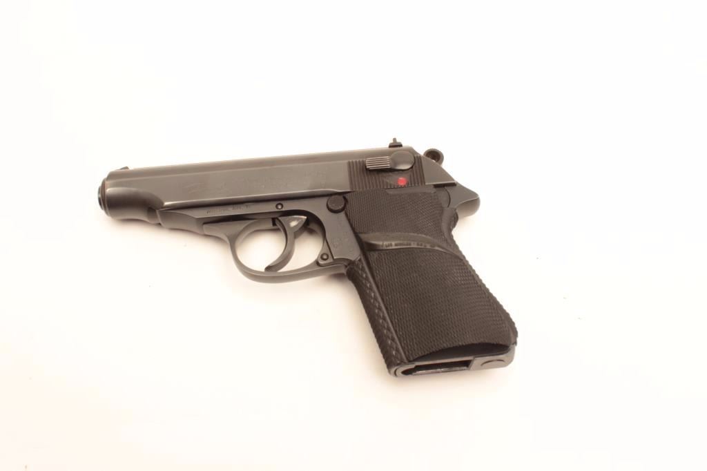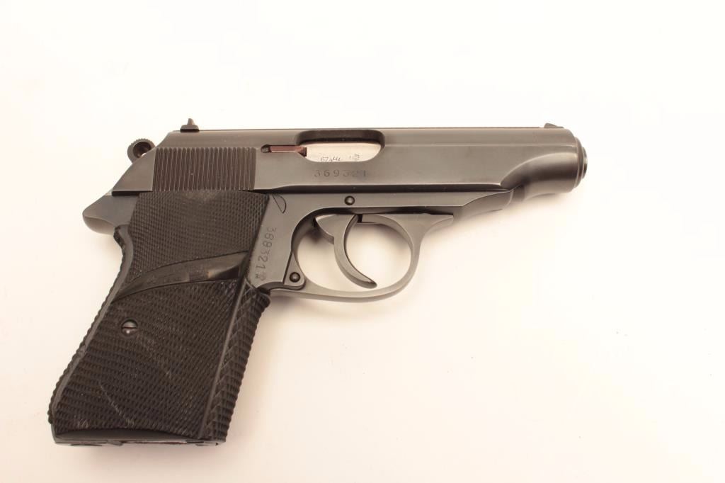 Walther PP semi-auto pistol, .32 caliber, Serial #369321. The pistol is as new in the box with all packaging material, manual, test target and two Walther marked magazines. The West German marked pistol is in as newcondition showing only light handling marks. The checkered rubber Pachmayr grips are in very good condition showing only storage wear. The red Walther box is in good condition with corner wear and a labelingsticker applied at the corner. The bore is very good, the action is crisp and markings are sharp on this new nearly new Walther in the factory box. The pistol is import marked by Interarms. Est.: $400-$800. (Modern).
