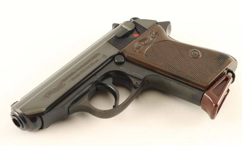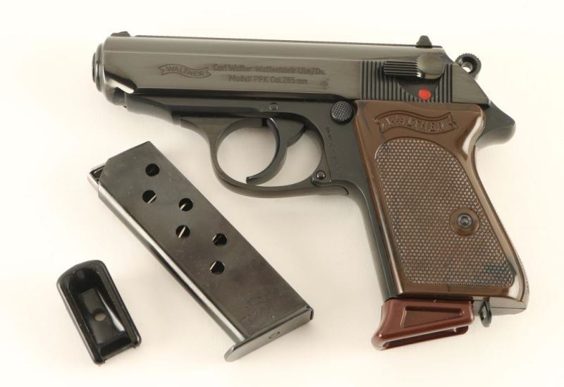 West Germany produced double action semi-automatic compact pistol chambered in 7,65mm, circa 1965. Features all steel construction, a blued finish, 3.3" barrel, fixed blade front sight, dovetailed rear window sight, serrated round hammer spur, loaded chamber indicator, thumb safety/decocker, push button magazine release, factory 7 round magazine w/ finger rest floorplate, smooth trigger and two-piece checkered brown plastic wrap-around grips w/ Walther banners. Includes a factory cardboard box with manual, spare magazine, extra finger rest floorplate and the original test target. No import marks observed. Pistol exhibits approximately 99%+ of it's original blued finish showing only a couple light handling marks. Action is smooth, bore is pristine and plastic grips are fine. Condition is near NRA new in box. ***C&R Firearm***
