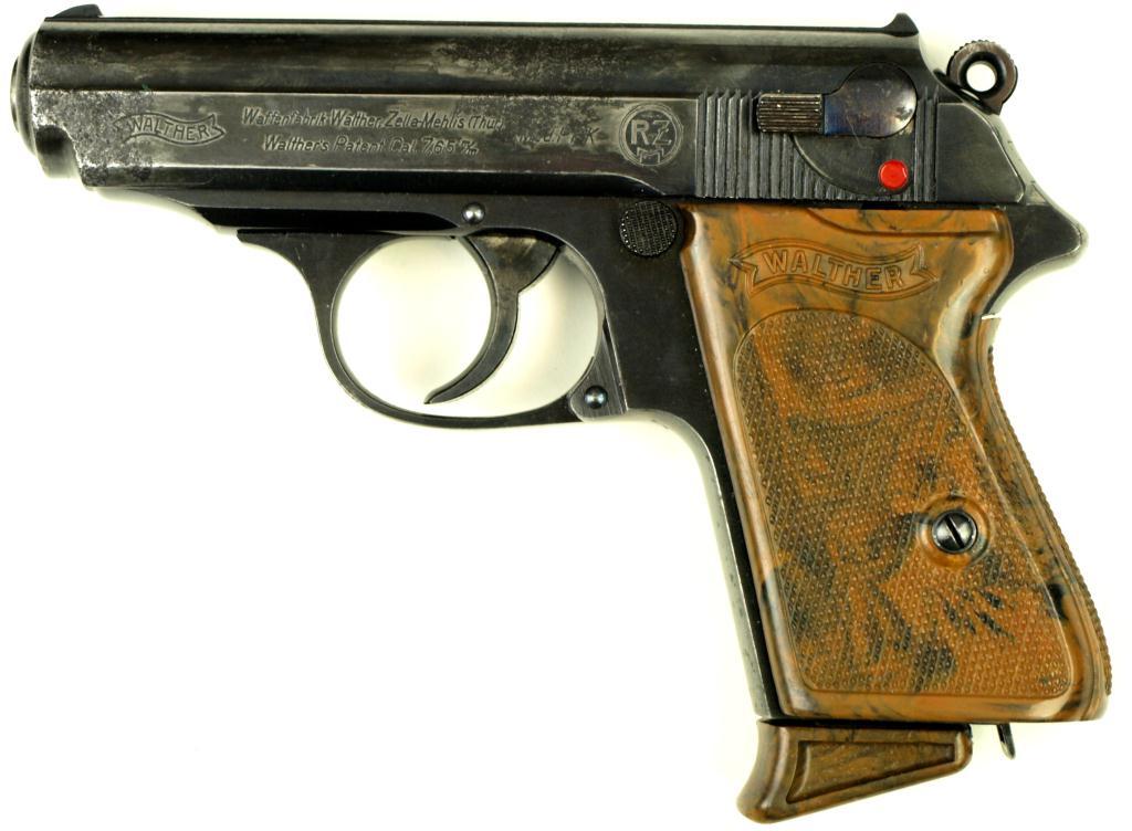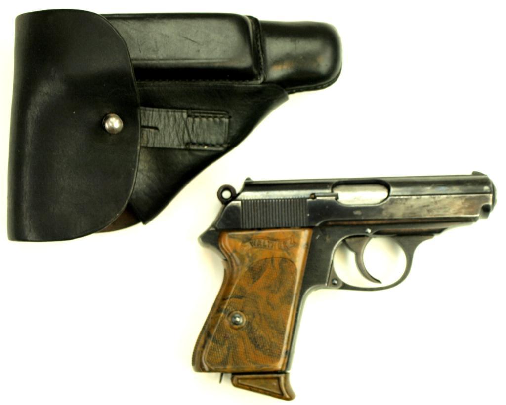 semi automatic pistol with blue finish brown plastic checkered grips and matching clip. Pistol shows moderate to heavy pin prick pitting on left and right sides of slide, remainder in very good condition. Includes DRGM marked leather holster and extra steel based clip. Action and bore are very good. FFL registered.