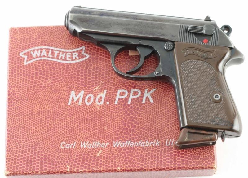 German made semiautomatic compact pistol, no importer marks observed (stamped "Made in West Germany"). Features blued finish, double action trigger, 3.3" barrel, fixed front sight with white dot, dovetailed rear sight with semi-circular notch & white outline, smooth trigger, serrated round hammer spur, thumb safety/decocker on the left side of the slide, loaded chamber indicator on the rear of the slide, push button magazine release, lanyard loop on butt, checkered brown plastic grips with molded Walther banners. Bore is very good condition. Retains 85% finish with bare metal on edges of slide and exposed rear of frame. Grips are very good. Includes the original factory cardboard box with manual, factory test target, (1) magazine (with brown plastic finger rest). Condition is NRA Very Good+ *** Modern Firearm ***