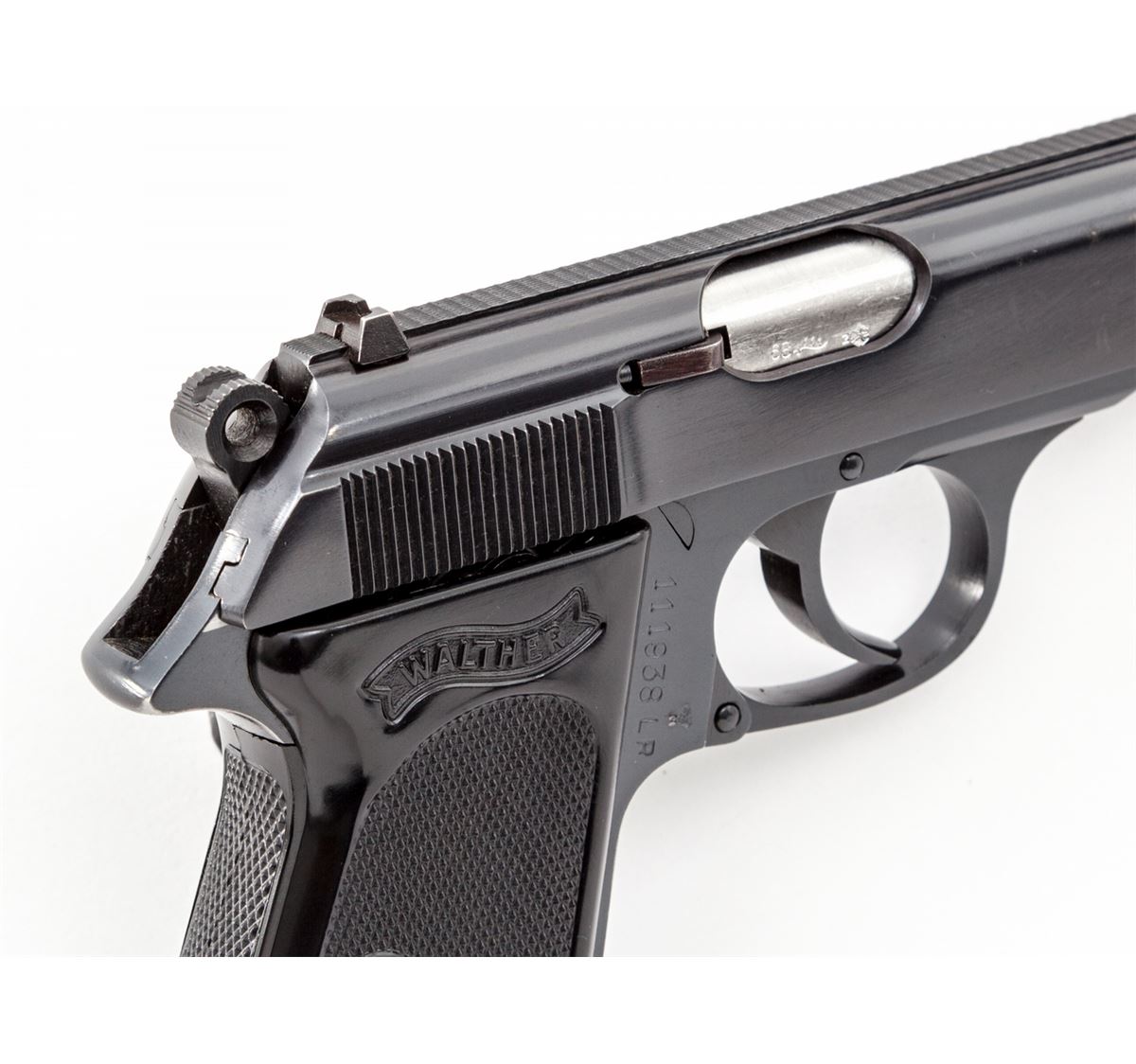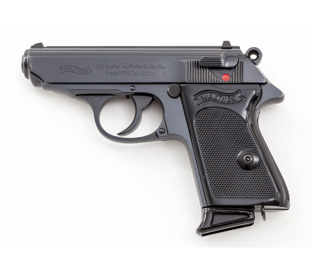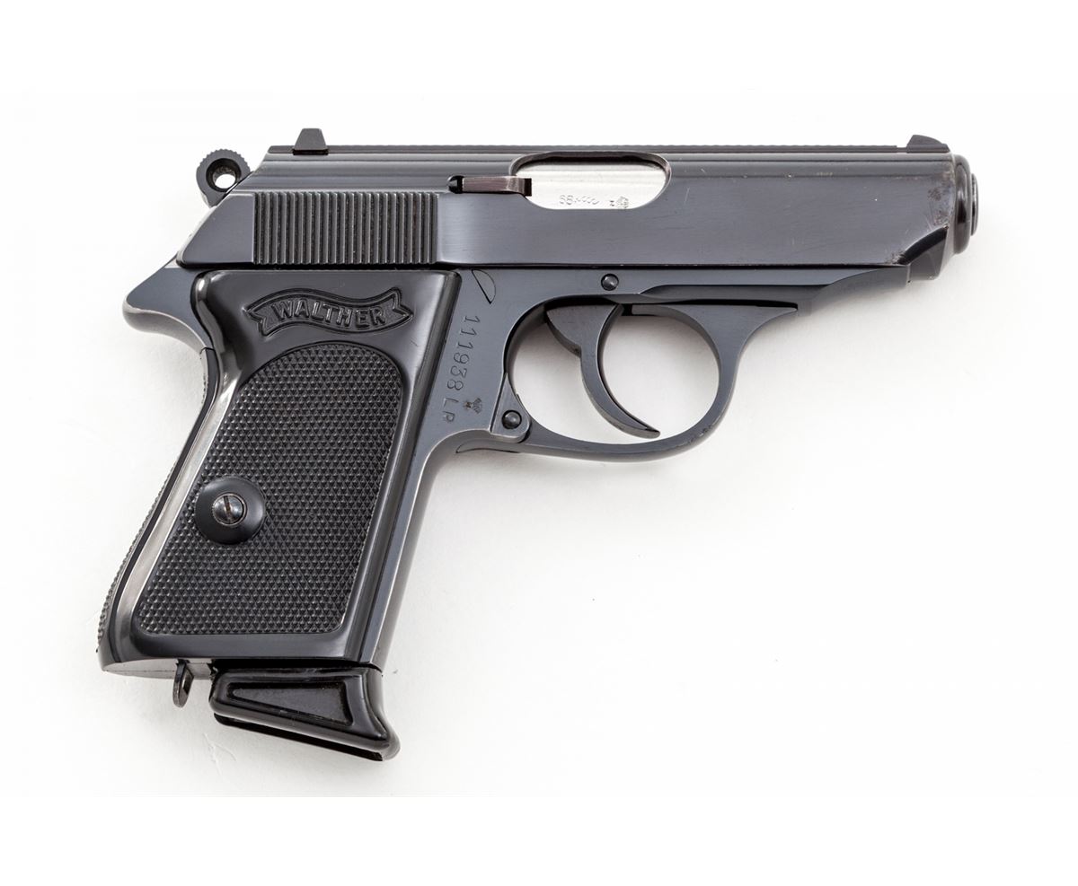 Walther PPK Semi-Automatic Pistol, #111938LR, .22 LR cal., 3-1/4'' barrel, blue finish, factory black checkered grips, with two magazines, cleaning rod and test target, in original box. Barrel dated 1968. Condition is excellent with light muzzle wear. Box with one small loss to top of lid at lower edge. Est.: $750-$1,000. (Modern/PPT)
