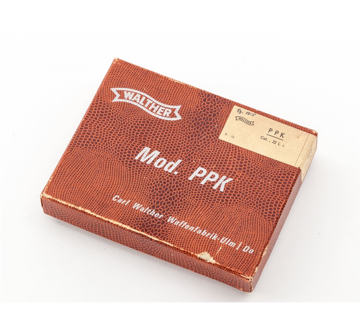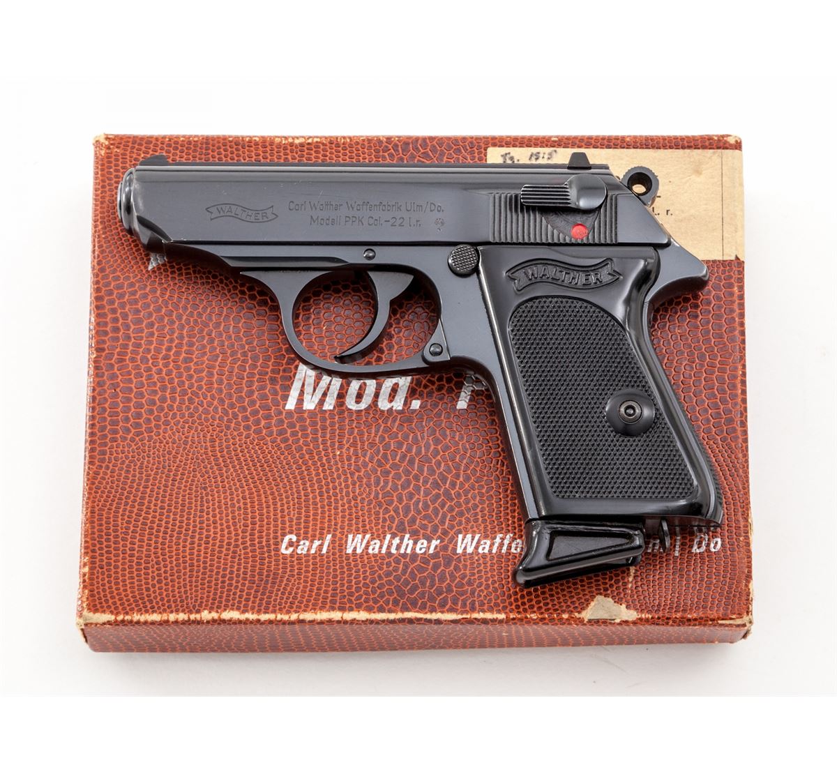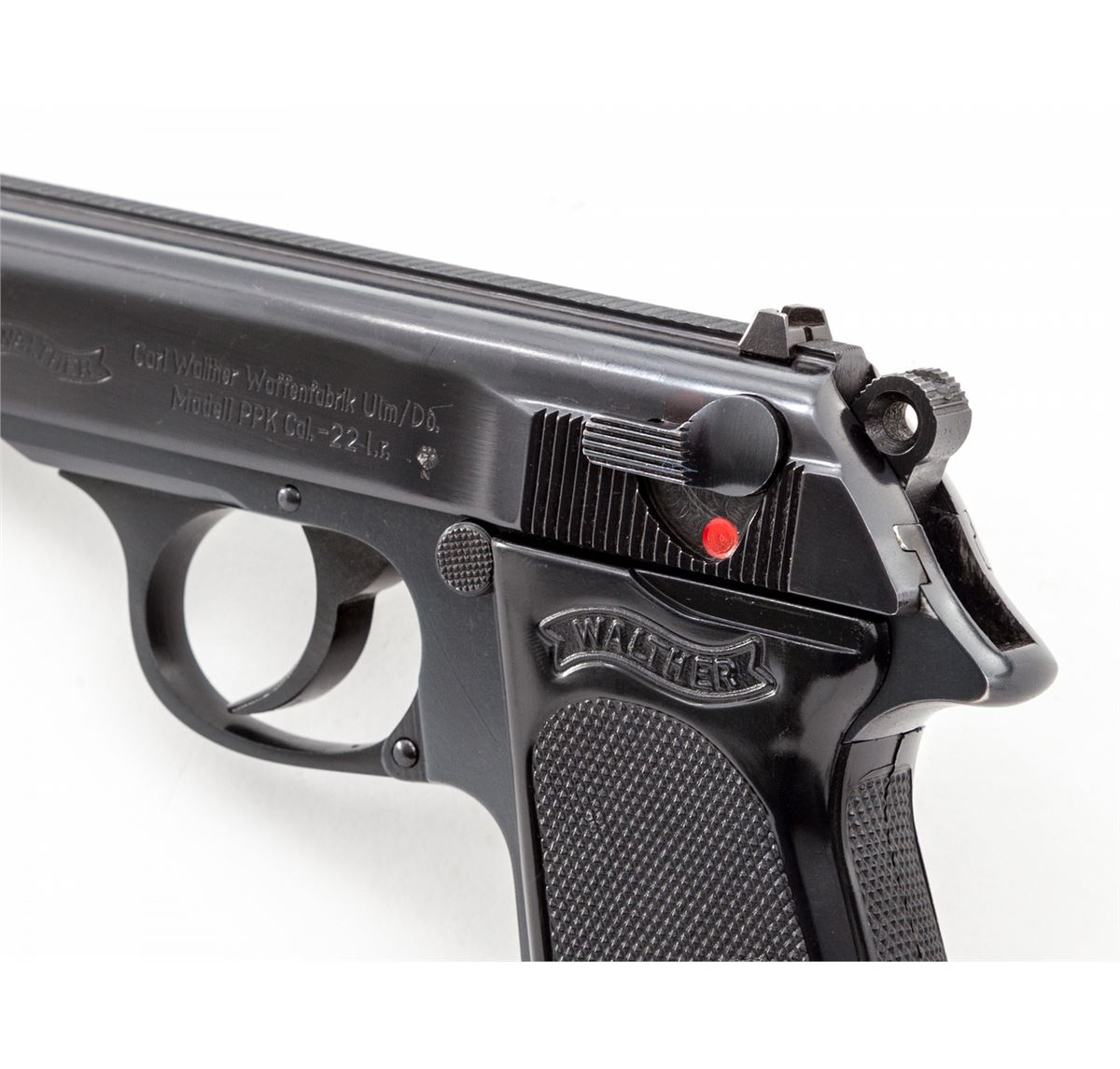 Walther PPK Semi-Automatic Pistol, #111938LR, .22 LR cal., 3-1/4'' barrel, blue finish, factory black checkered grips, with two magazines, cleaning rod and test target, in original box. Barrel dated 1968. Condition is excellent with light muzzle wear. Box with one small loss to top of lid at lower edge. Est.: $750-$1,000. (Modern/PPT)