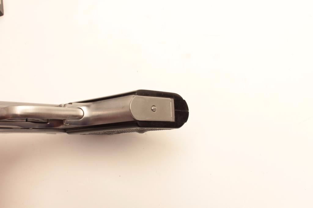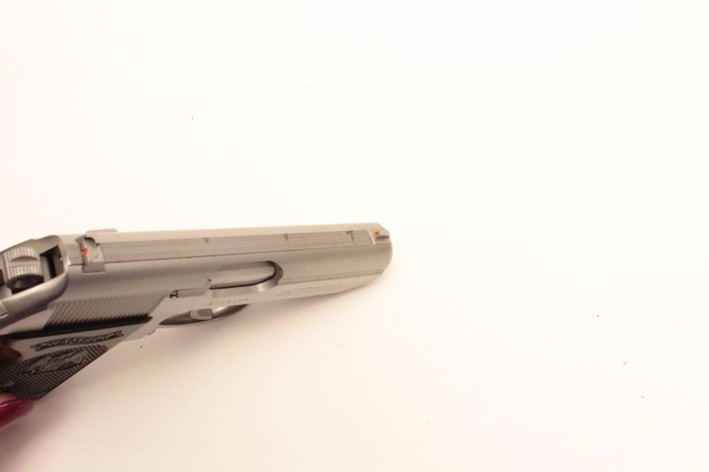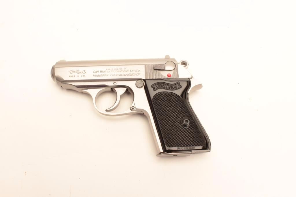 Walther PPK semi-auto pistol, .380 caliber, Serial #A008104. The pistol is as new in the box with an extra set of grip scales and two Walther marked magazines. The pistol is finished in stainless marked, “MADE IN USA”and is in as new condition showing only light handling marks. The barrel is marked 9mm Kurz/ .380 ACP caliber. The checkered plastic Walther marked grips are in very good condition showing only storage wear. Theblack plastic factory box is in good condition. The bore is very good, the action is crisp and markings are sharp on this new nearly new Walther in the factory box. The pistol is marked by Interarms on the rightside of the slide. Est.: $500-$1,000. (Modern).