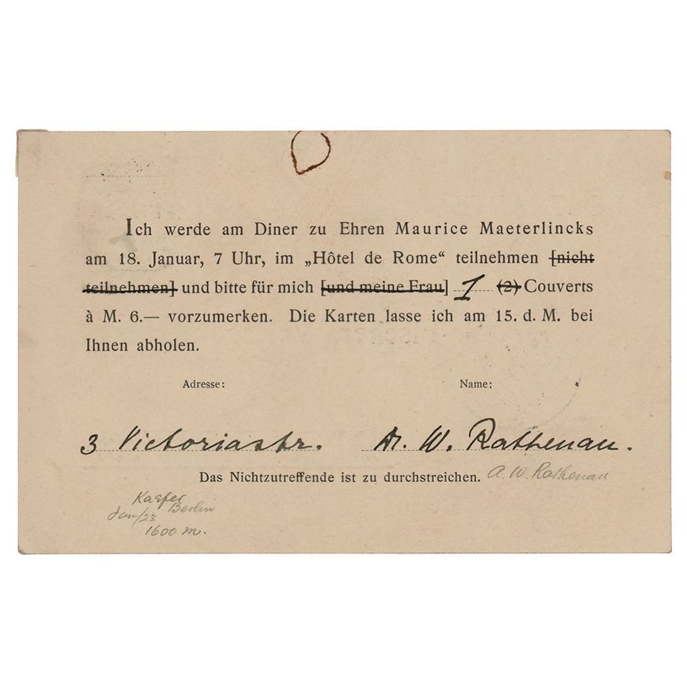 Postcard signed "Dr. W. Rathenau," one page, 5.5 x 3.5, postmarked January 13, 1903. Invitation response card submitted to "Fischer, Verlag" in Berlin, in part (translated): "I will be attending the dinner in honor of Maurice Maeterlinck on January 18th, 7:00 am, in the 'Hotel Rome.'" In fine condition, with a rusty circular paperclip impression to the top.