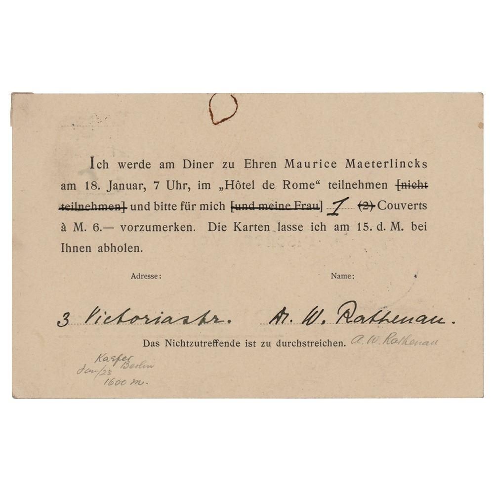 Important German statesman and socialist leader (1867–1922) who served as foreign minister during the Weimar Republic and initiated the Treaty of Rapallo; he was assassinated by the ultra-nationalist Organisation Council terrorist group. Postcard signed "Dr. W. Rathenau," one page, 5.5 x 3.5, postmarked January 13, 1903. Invitation response card submitted to "Fischer, Verlag" in Berlin, in part (translated): "I will be attending the dinner in honor of Maurice Maeterlinck on January 18th, 7:00 am, in the 'Hotel Rome.'" In fine condition, with a rusty circular paperclip impression to the top.