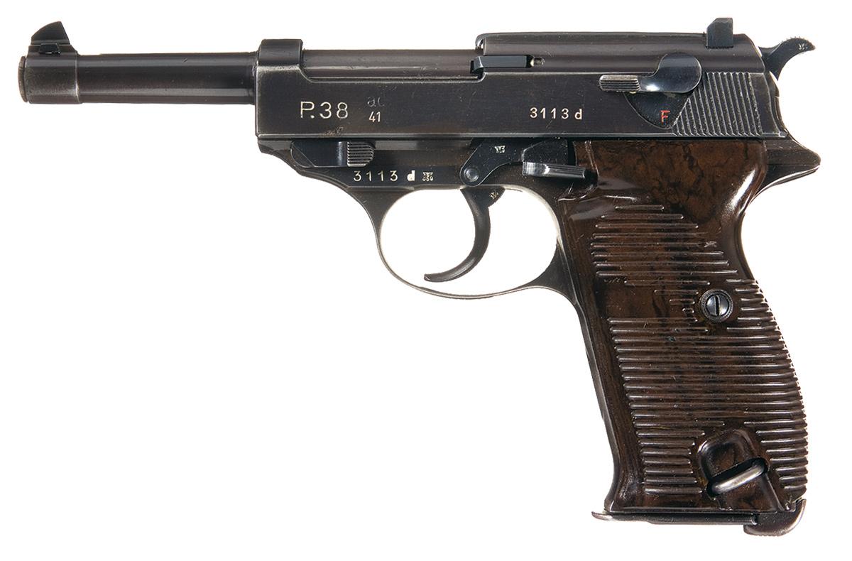The left side of the slide is marked "P.38 ac/41" with the serial number, and the right side has the "eagle/swastika" firing proof flanked by "eagle/359" proofs. The "359" proof is repeated on the frame, barrel lug, locking block, and a number of the small parts. Lug is also marked "8,82" and "B33". Ribbed plastic grips. Bottom of magazine floor plate serialized "3113d" which corresponds to the pistol's serial number.