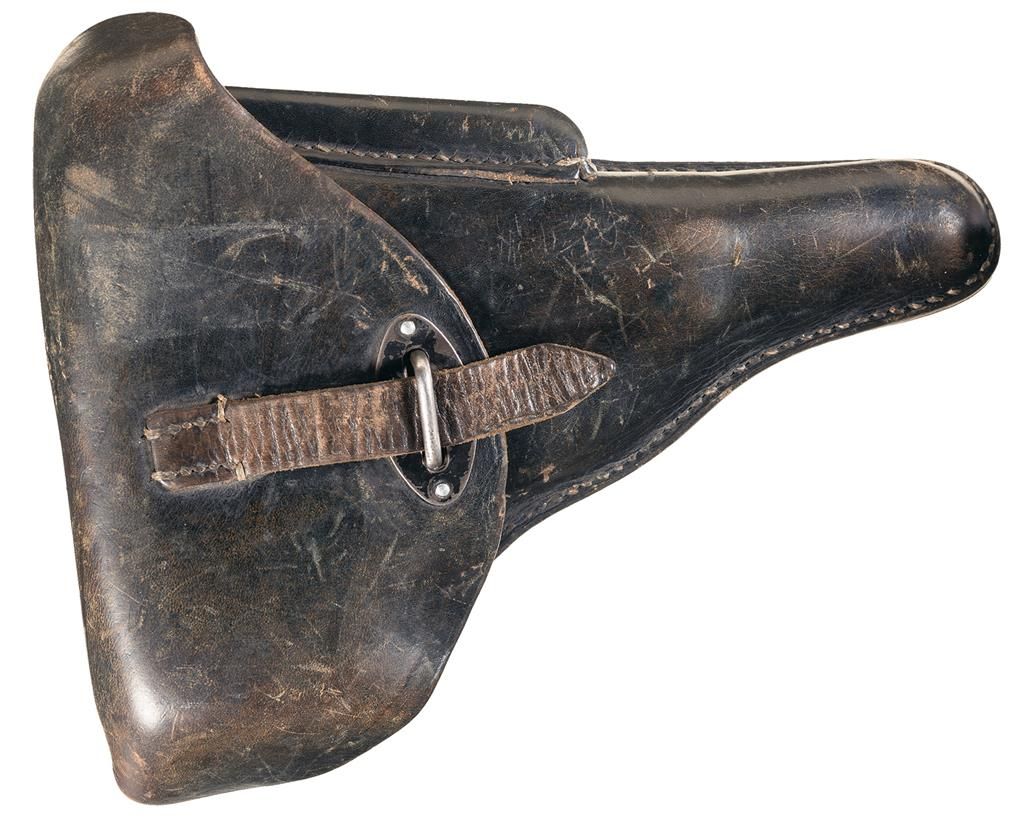 Excellent, with 95% plus of the original blue finish, showing areas of gray and plum patina on the frame, bright edge wear and mild handling marks. The grips are also excellent, with some light scratches and scuffs. Holster is good, with a number of hand-scratched markings on the back, scuffs and stains. Mechanically excellent.