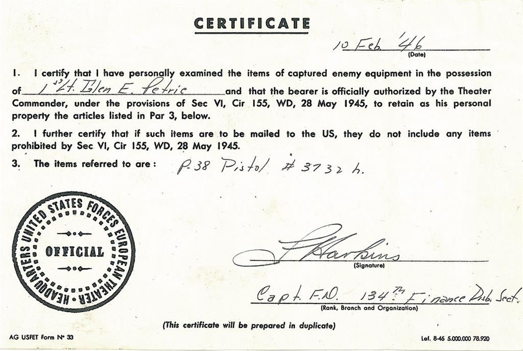 Fixed sights, with the in-line "ac 44" code on the left side of the slide. Markings and proofs are standard, with a pair of ribbed black plastic grips. With a black leather flap holster (jln/1942) and a capture certificate dated 10 Feb 1946, identifying this pistol by number and listing the claimant as 1st Lieutenant Glen E. Petrie, and a short biography of Lieutenant (later Colonel) Petrie, a member of the 518th Port Battalion, part of the 1st Engineer Special Brigade, which would participate in the establishment and operation of "Mulberry A", the mobile harbor used to offload heavy oceangoing craft onto Omaha Beach in the immediate aftermath of Operation Neptune, and also the clearing and operation of the port at Cherbourg. After the War, Petrie served as Comptroller for several units, was Commanding Officer of the 2nd Transportation Battalion and Executive Officer of the Supply and Maintenance Agency.