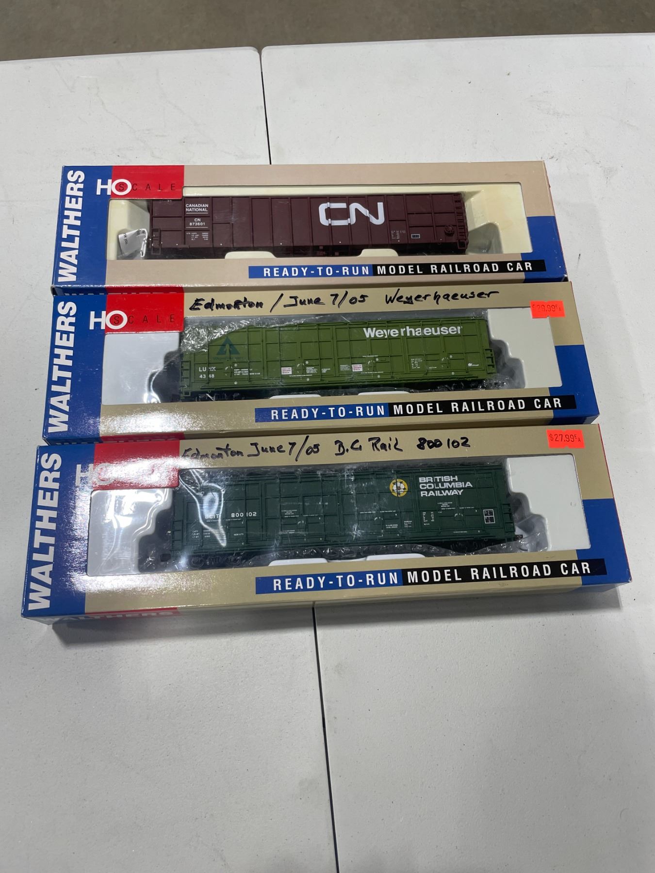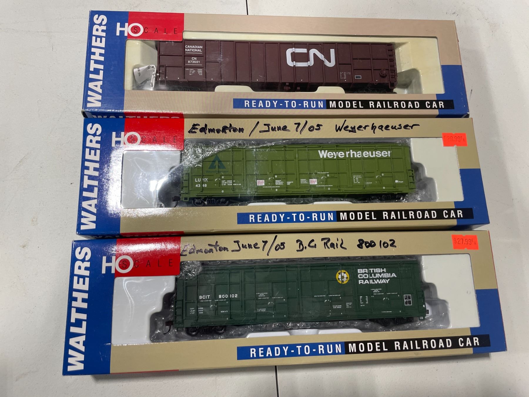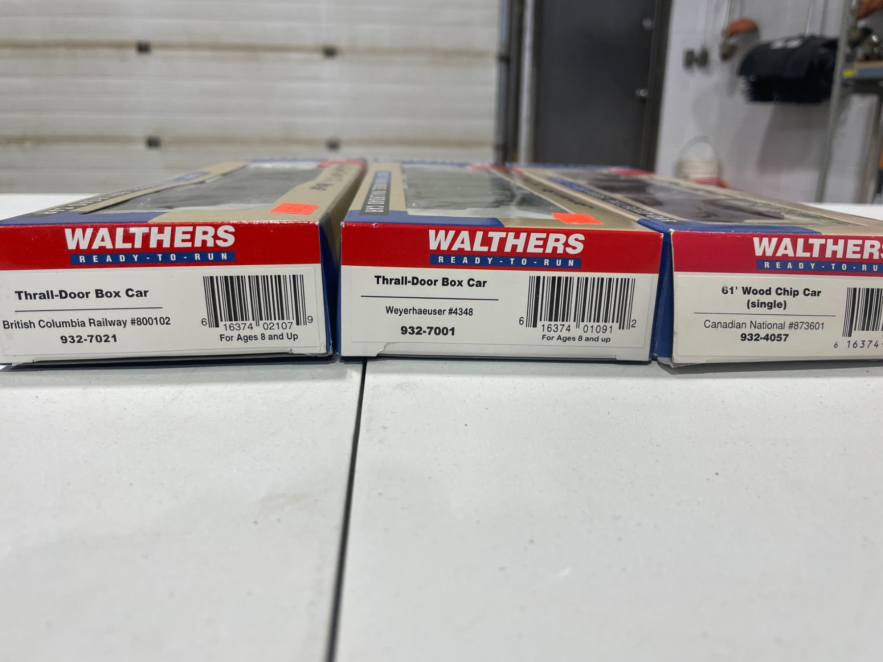 Includes 61' Wood Chip Car (single( Canadian National #873601 932-4057 - Thrall-Door Box Car British Columbia #800102 932-7021 - Thrall-Door Box Car Weyerhaeuser #4348 932-7001