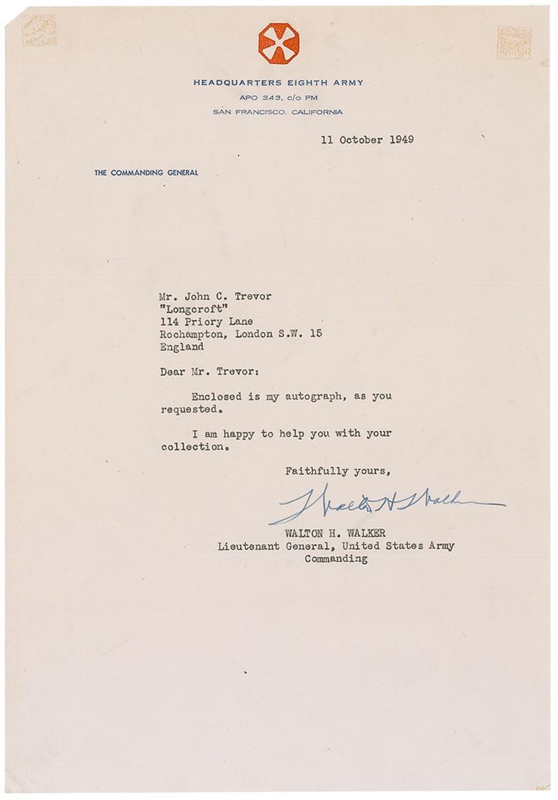 Army officer (1889–1950) and the first commander of the US Eighth Army during the Korean War. TLS signed “Walton H. Walker,” one page, 7.25 x 10.5, Headquarters Eighth Army letterhead, October 11, 1949. Brief letter to a collector. In full: :”enclosed is my autograph, as you requested. I am happy to help you with your collection.” Two blocks of toning to top corners from tape on reverse, and some scattered light creases and wrinkles, otherwise fine condition.