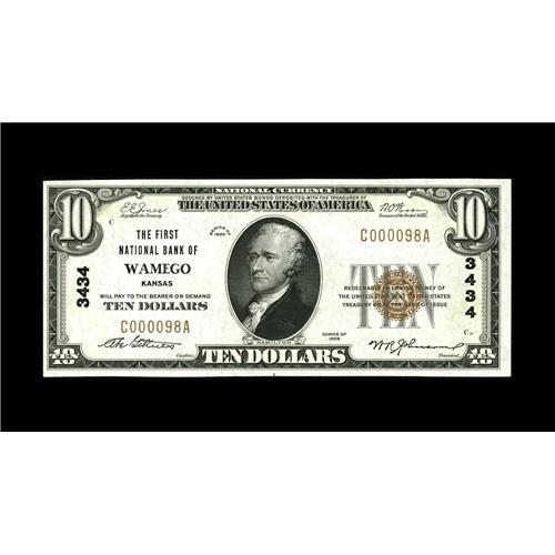 <B>Wamego, KS</B></I> - $10 1929 Ty. 1 <B>The First NB</B></I> Ch. # 3434<BR>Another <B>Choice Crisp Uncirculated,</B></I> the adjacent sheet mate to the note immediately above and in virtually identical condition.<BR><BR><b>Shipping:</b> Coin/Currency (<a target="_blank" href="http://www.heritageauctions.com/common/shipping.php">view shipping information</a>)