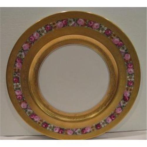 This fantastic LargerCharger is decorated with lovely blooming roses and then decorated with a wide band of gold gilt. This charger is in SUPERIOR condition with no chips, cracks, dings or hairlines and does have a small amount of wear to the gold gilding. The charger is marked on the back withthe familiar Wanamaker logo.