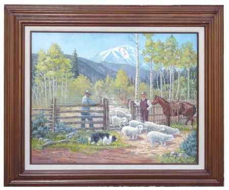 Signed original oil on board depicting sheep ranchers in the mountains. Condition: very good. 20" x 24" (27" x 31" framed)