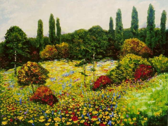 Wanda Kippenbrock's imaginative work expresses a strong sense of design, composition, and delicate facility. Finding beauty in all of nature, she transforms floral art into virtuoso displays while her landscapes fill one with vibrant stillness. This is the original painting from which the canvas print edition was made. 30x40 in. original oil painting on canvas, signed at lower left. Domestic shipping $85. International depends upon location.