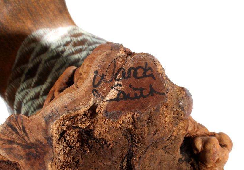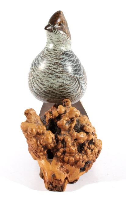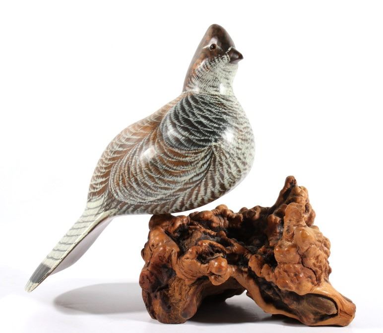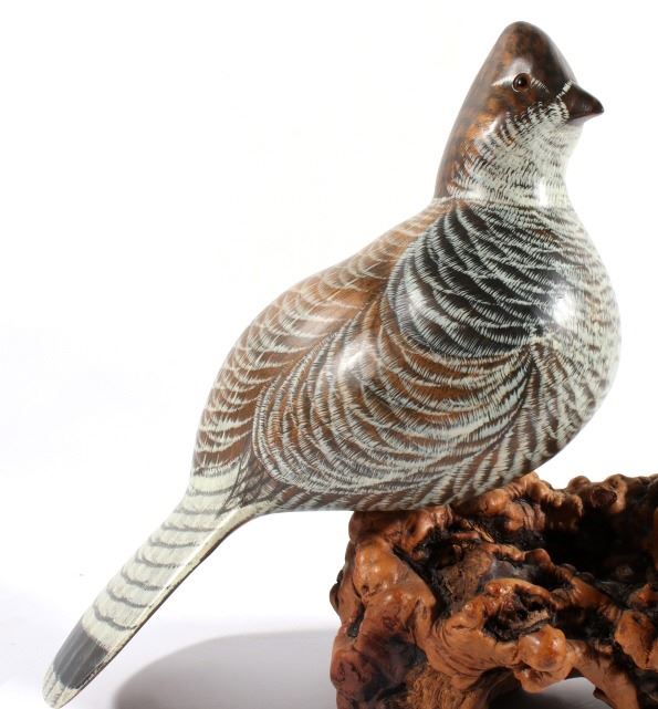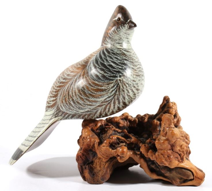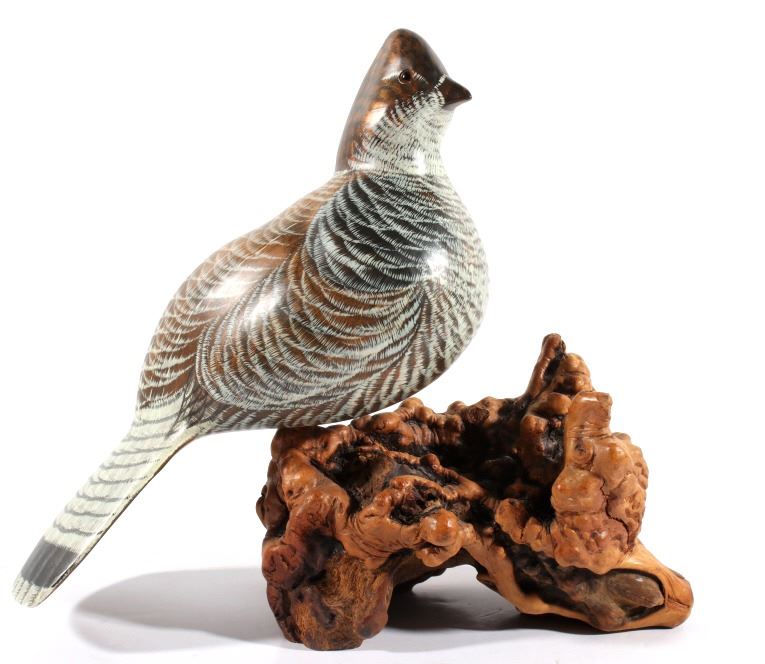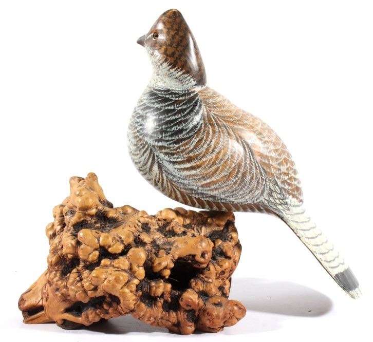 Available in this lot we have a hand carved signed quail decoy statue by Wanda Smith. Wanda is a local Montana artist in the Gallatin valley and has done work with Big Sky Carvers located in Manhattan, Montana. The statue depicts a quail, most likely a Bobwhite, standing on a section of burl wood. The quail shows a wonderful carved figure with a detailed hand painted coloration and feather patterns. The bobwhite is set onto a piece of highly charactered burl wood with contrasting light brown and black coloration. The bottom of the wood is signed "Wanda Smith". The decoy shows good condition overall with some minor wear on the head. The bird measures approximately 9" long by 4 3/4" wide and sits 12 1/2" tall with the piece measuring 13 1/2" long by 6 3/4" wide overall.