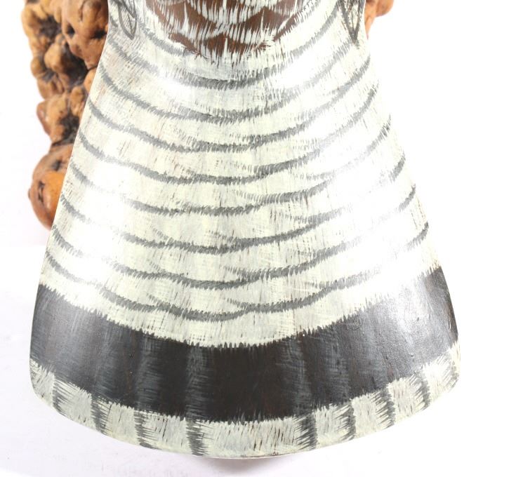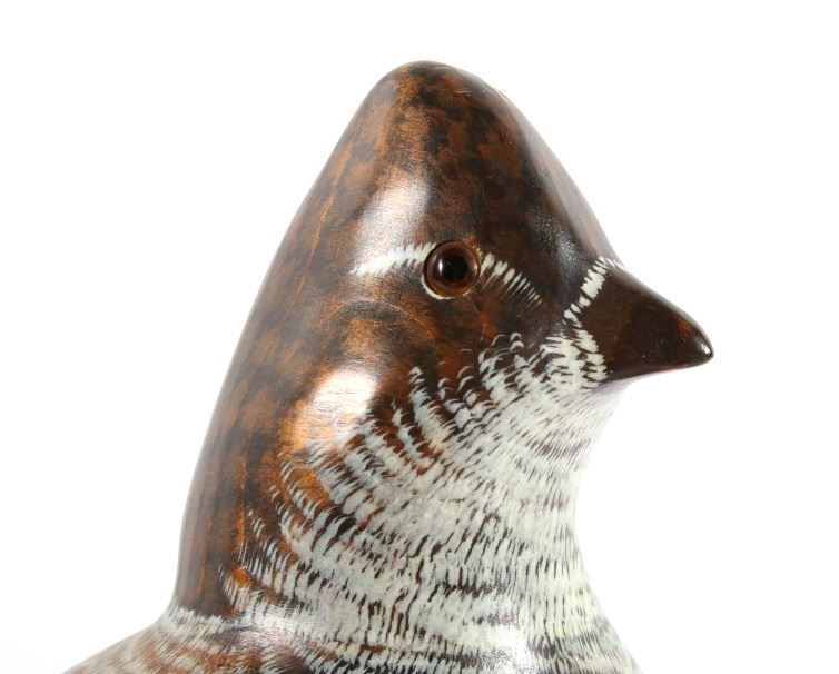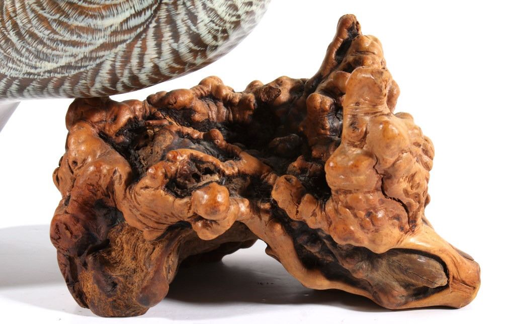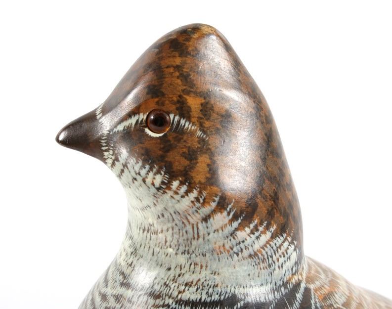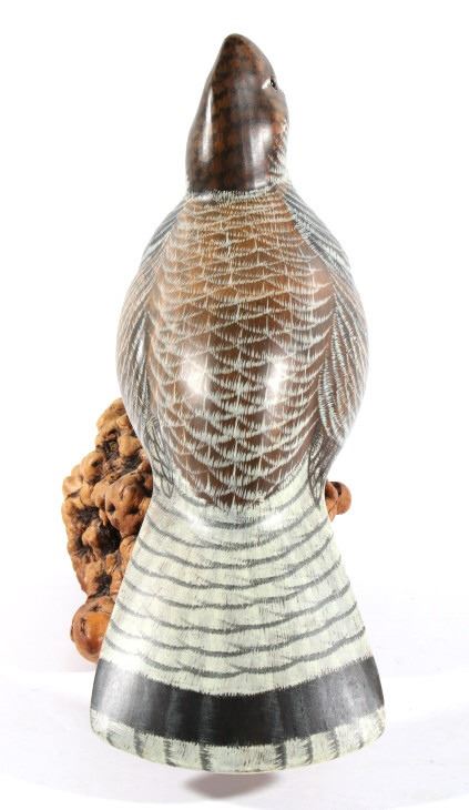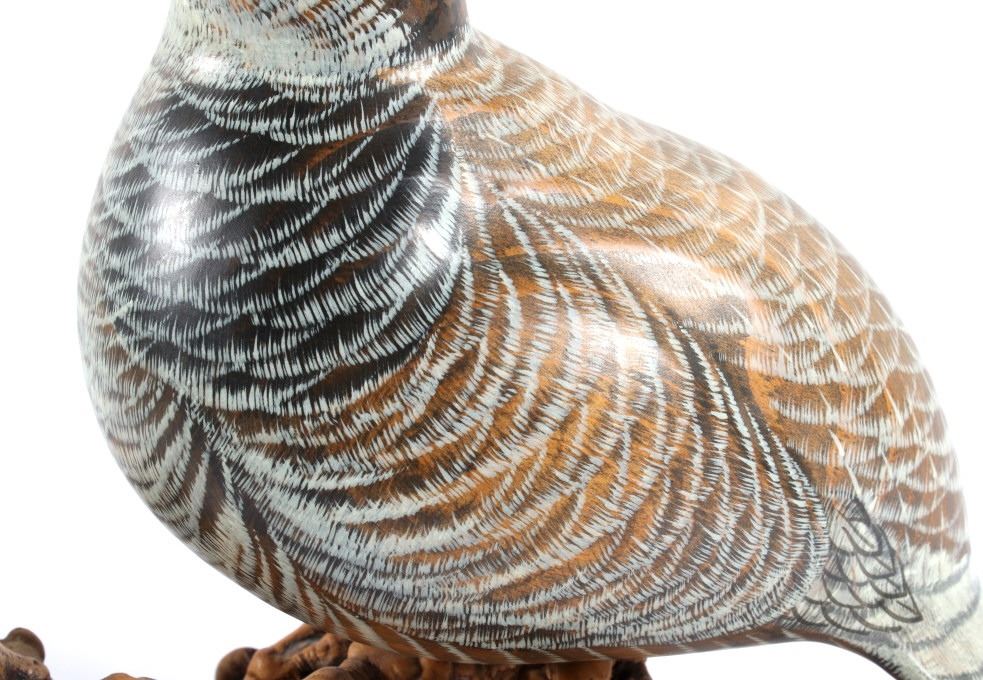 Available in this lot we have a hand carved signed quail decoy statue by Wanda Smith. Wanda is a local Montana artist in the Gallatin valley and has done work with Big Sky Carvers located in Manhattan, Montana. The statue depicts a quail, most likely a Bobwhite, standing on a section of burl wood. The quail shows a wonderful carved figure with a detailed hand painted coloration and feather patterns. The bobwhite is set onto a piece of highly charactered burl wood with contrasting light brown and black coloration. The bottom of the wood is signed "Wanda Smith". The decoy shows good condition overall with some minor wear on the head. The bird measures approximately 9" long by 4 3/4" wide and sits 12 1/2" tall with the piece measuring 13 1/2" long by 6 3/4" wide overall.