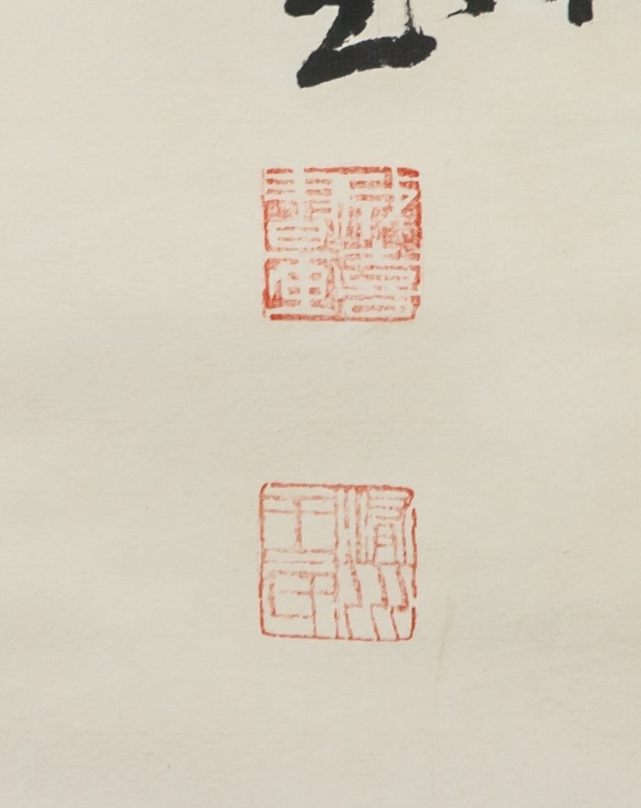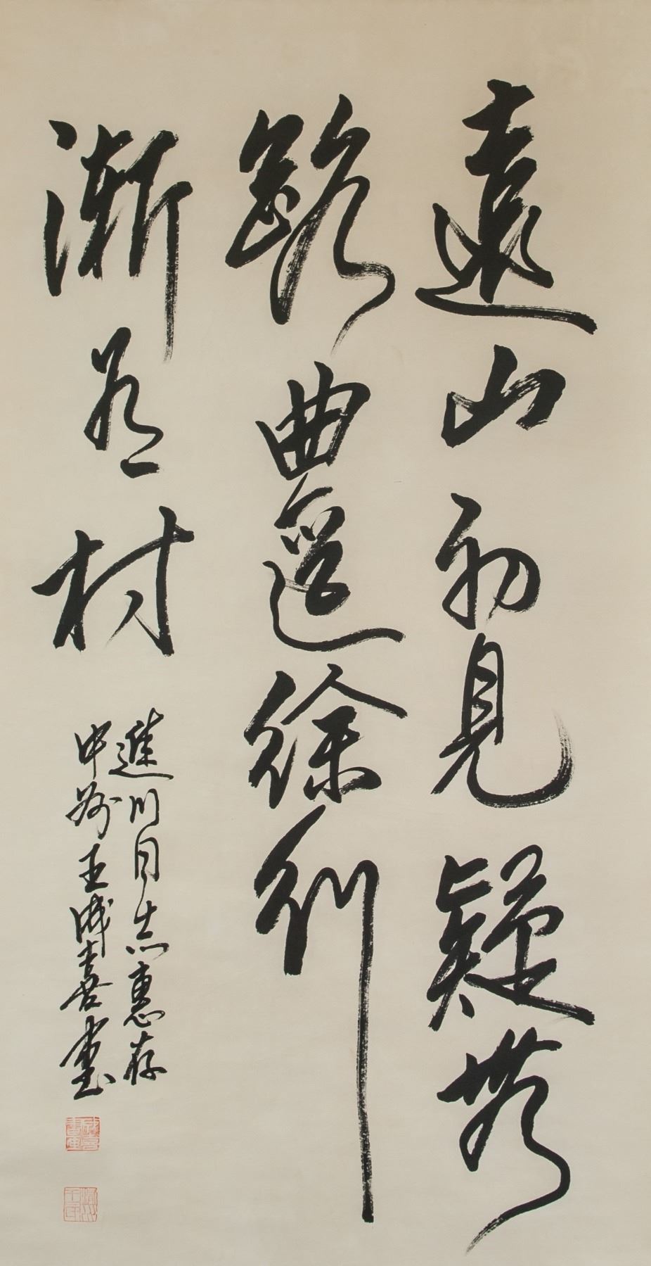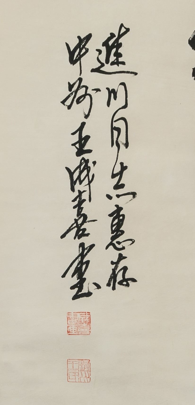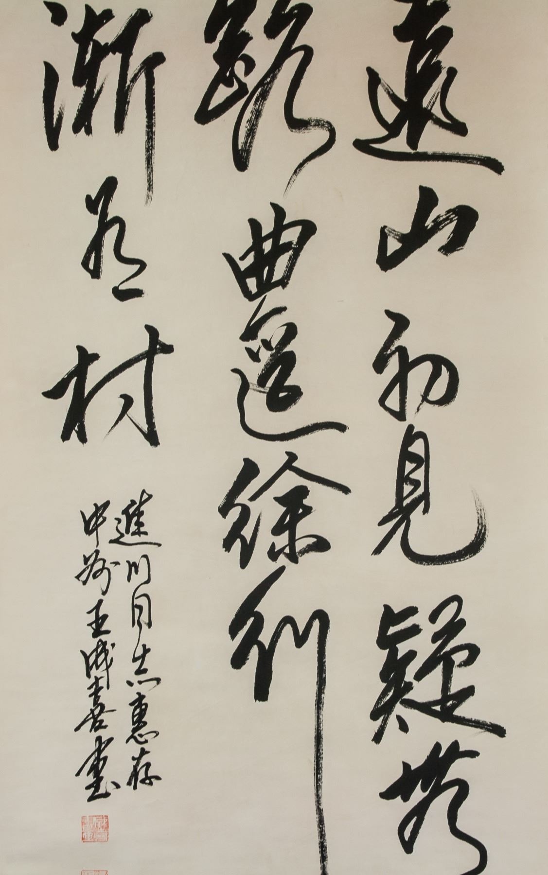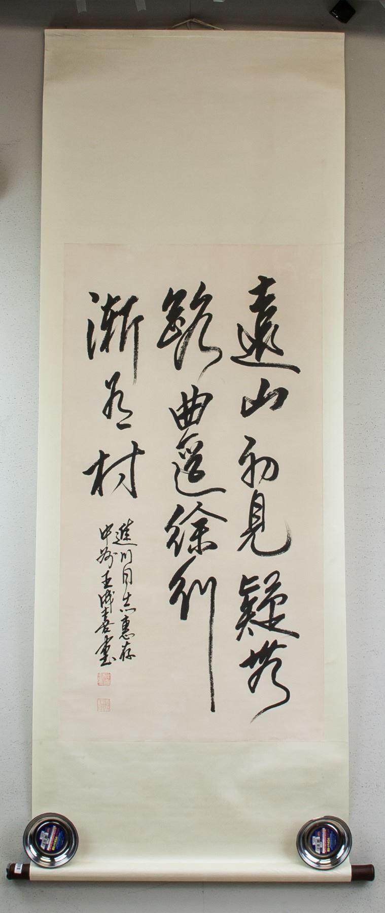 Ink on paper; hanging scroll. Featuring a calligraphy. Signed Wang Chengxi b. 1940 Chinese, and inscribed with two artist seals. 100 x 54 cm. Wang Chengxi is a Chinese visual artist who was born in 1940. Many works by the artist have been sold at auction, including 'Untitled' sold at Poly International Auction Co. 'Breeze masters' Fan Artworks' in 2013 for $39,394.