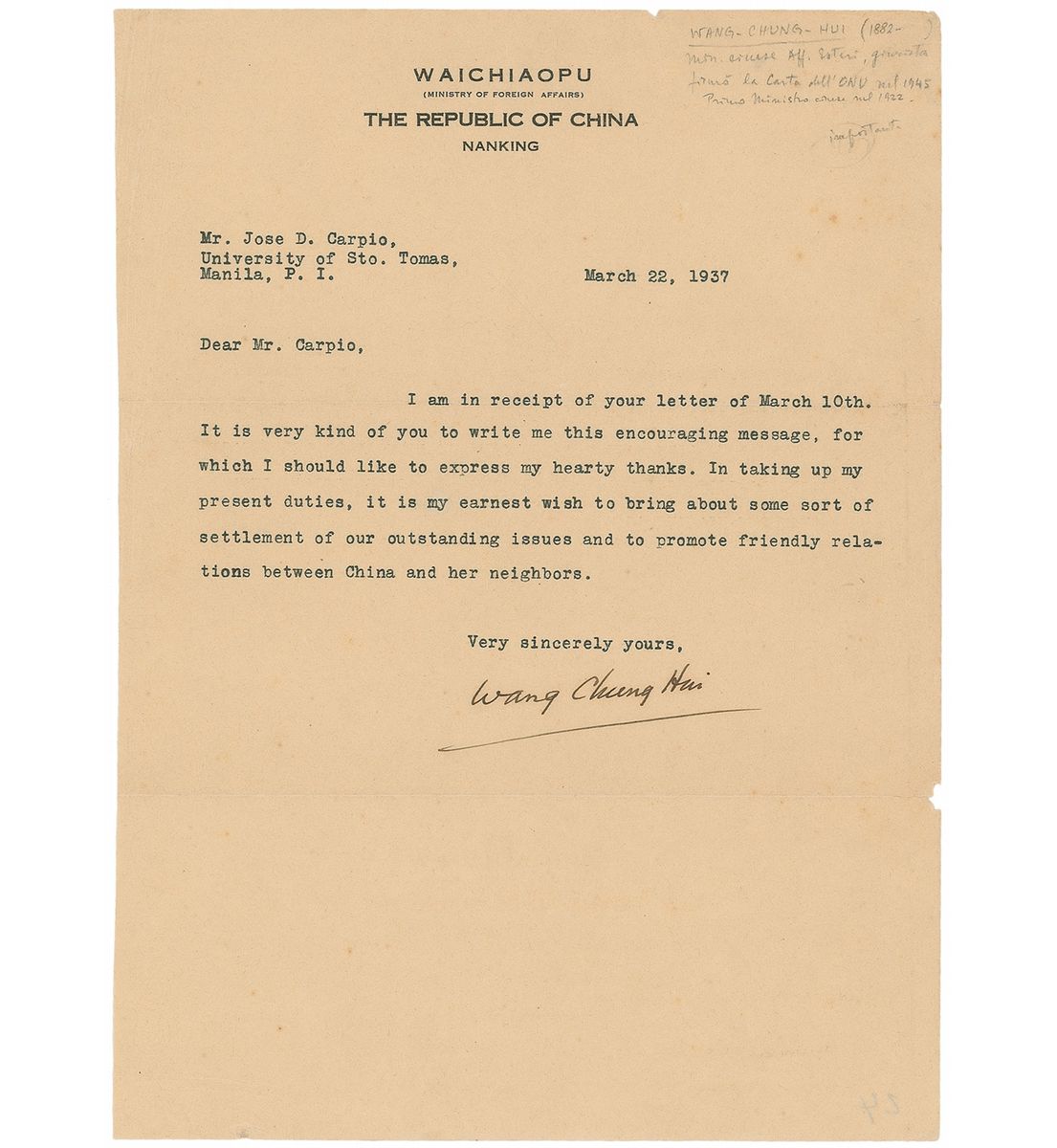 Chinese foreign minister (1881–1958) who served from 1937 to 1941; a close associate of China’s founding father, Sun Yat-sen. TLS signed “Wang Chung Hui,” one page, 8 x 11, Republic of China Ministry of Foreign Affairs letterhead, March 22, 1937. Letter to Jose Carpio reads, in full: “I am in receipt of your letter of March 10th. It is very kind of you to write me this encouraging message, for which I should like to express my hearty thanks. In taking up my present duties, it is my earnest wish to bring about some sort of settlement of our outstanding issues and to promote friendly relations between China and her neighbors.” With moderate creasing to upper left corner and two small chips to edges, otherwise fine condition. The year this letter was penned was Wang’s first in office as foreign minister—a post he would hold for five years; it was a chaotic time during which Japanese invasion would kill millions of Chinese civilians. Six months after he mailed this correspondence, on August 21, 1937, he signed the Sino-Soviet Non-Aggression Pact, guaranteeing the Soviet Union's financial support of the Kuomintang government.