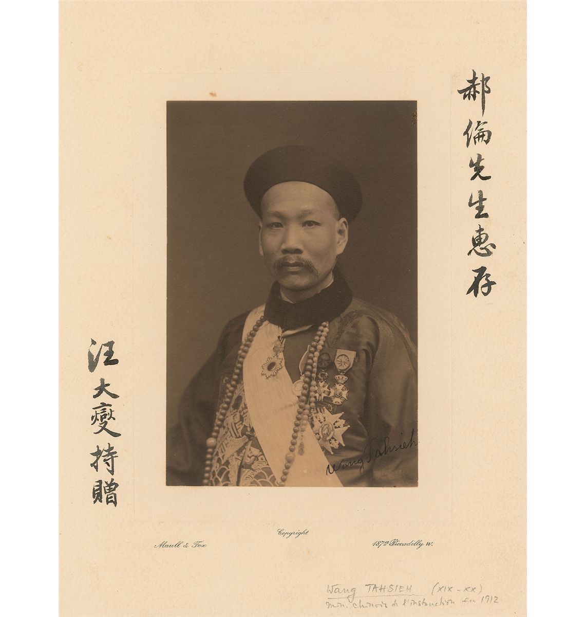 Premier of China (1860–1929); he was in office in both 1917 and 1922. Exceptional matte-finish 7.25 x 9.5 Maull & Fox photo, boldly signed in black ink on the image in English, “Wang Tahsieh,” and again on the mount in Chinese. Reverse of photo bears an official photographer’s label from Maull & Fox of Piccadilly, London. In fine condition, with a small speck of toning above image, and some adhesive remnants to borders of reverse. Maull and Fox, in business from 1879–1885, was a British photography company specializing in portraits of noted individuals: the studio’s time period definitively dates Wang’s age in this photo to between 19 and 25.