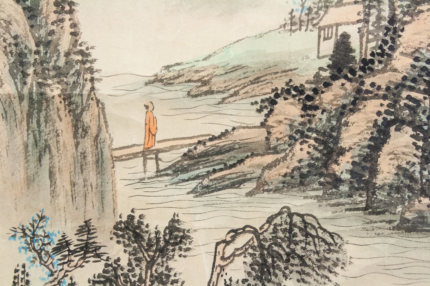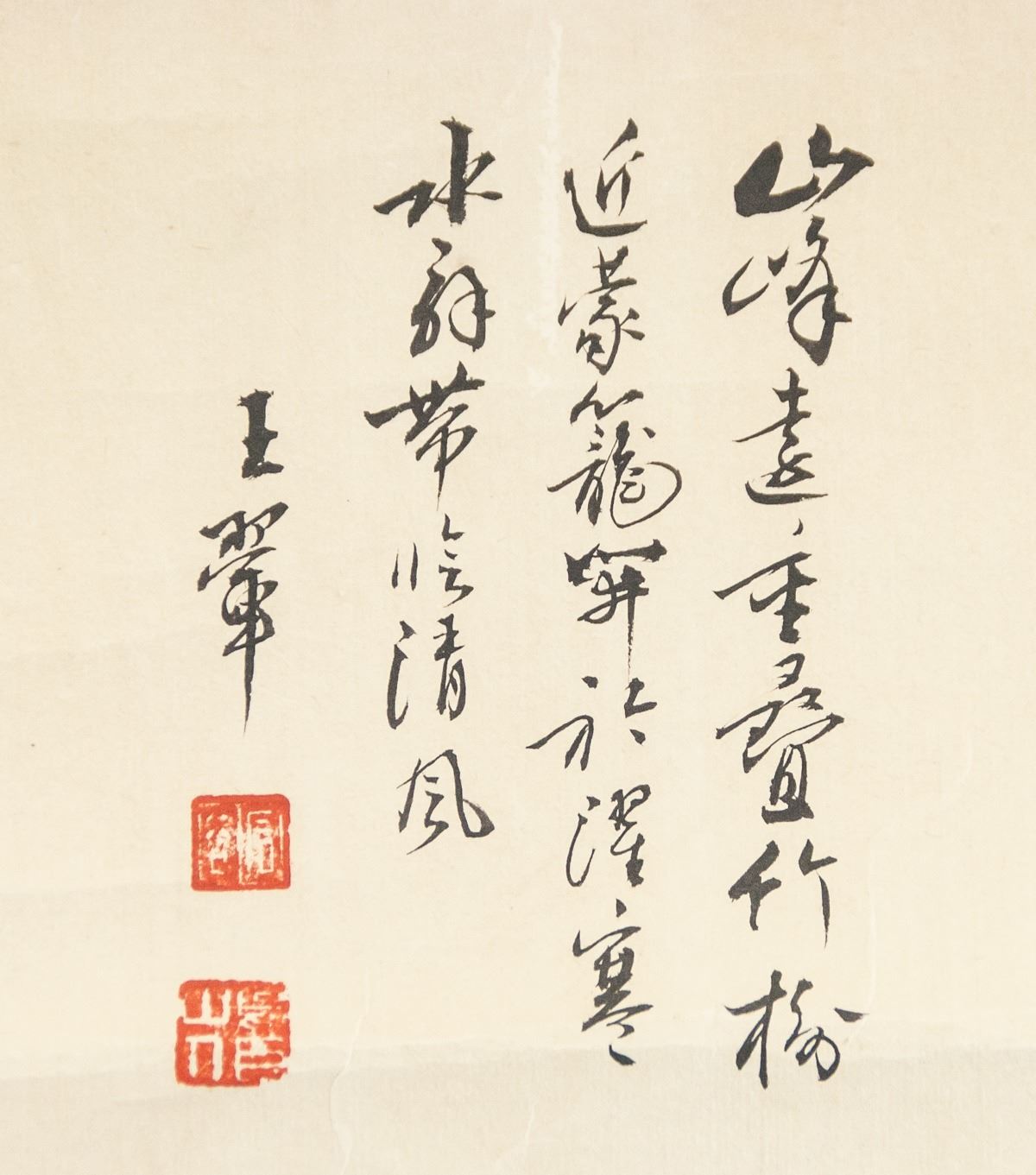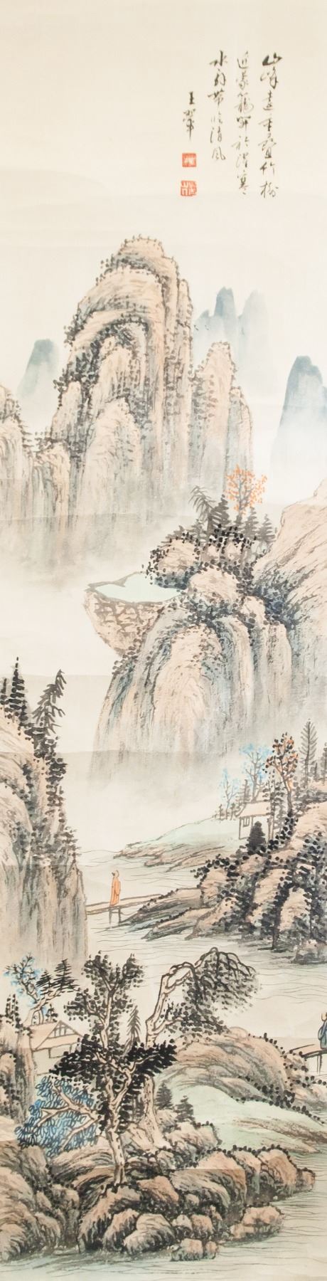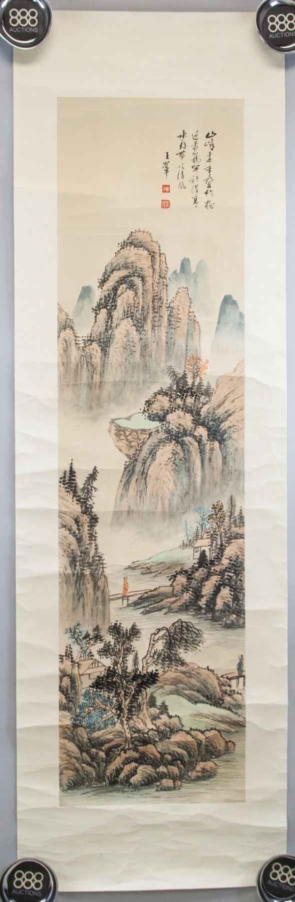 Ink and watercolor on paper roll. Featuring mountainous scenery. Signed "Wang Hui" to the top right in Chinese characters. Inscribed with two seals. Attributed to Wang Hui (1632-1717, Chinese). 128 x 35 cm.
