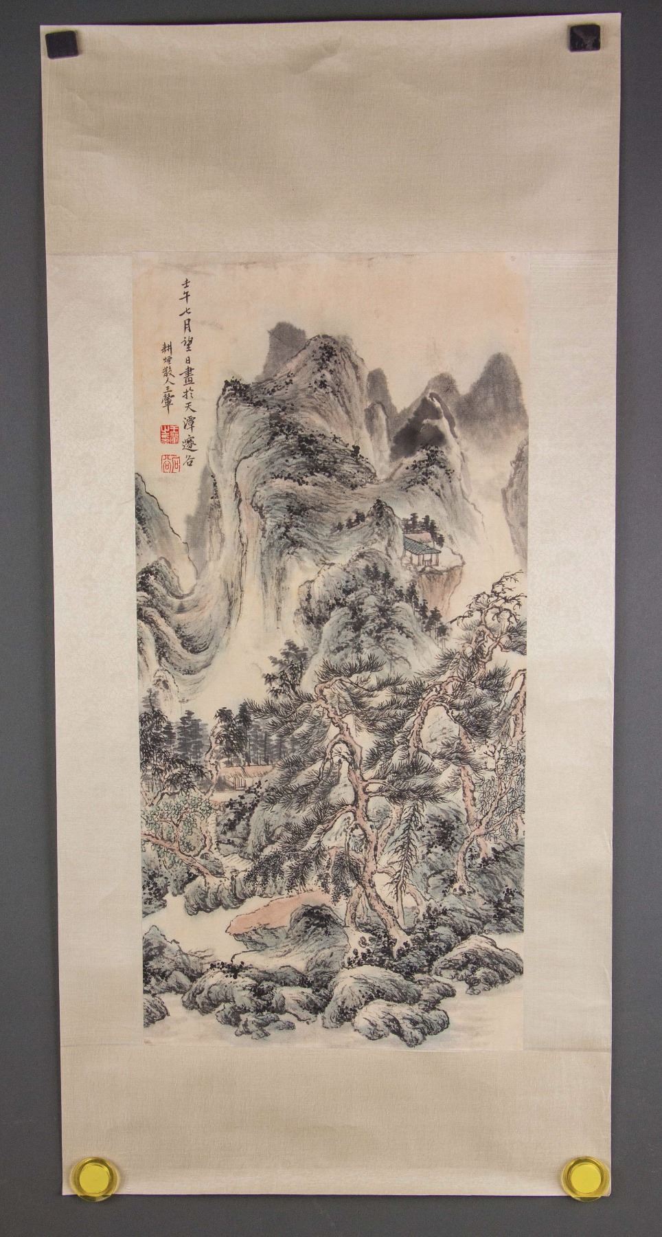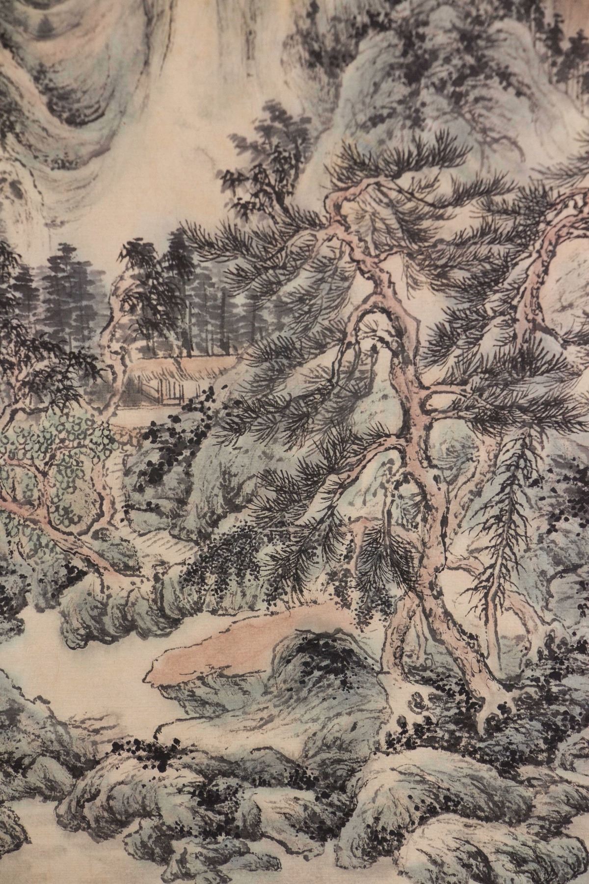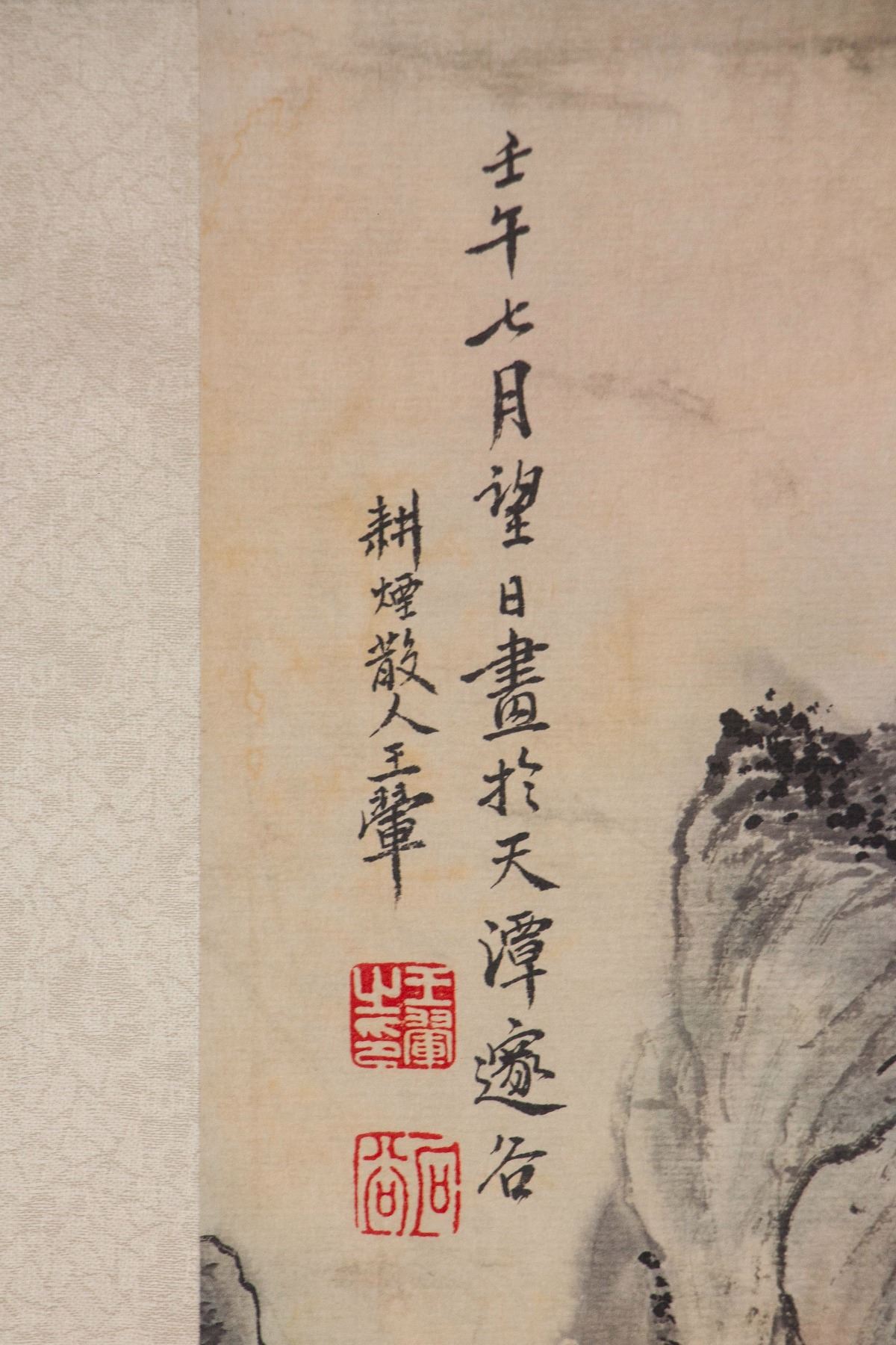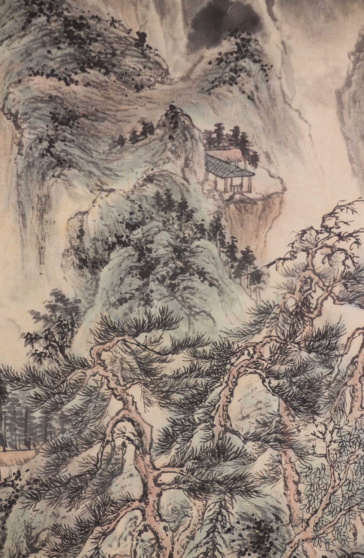 Mountainous landscape and cabin; Chinese ink and watercolour on paper roll; signed Wang Hui (1632-1717); inscribed with 2 artist seals; 68 cm x 31 cm