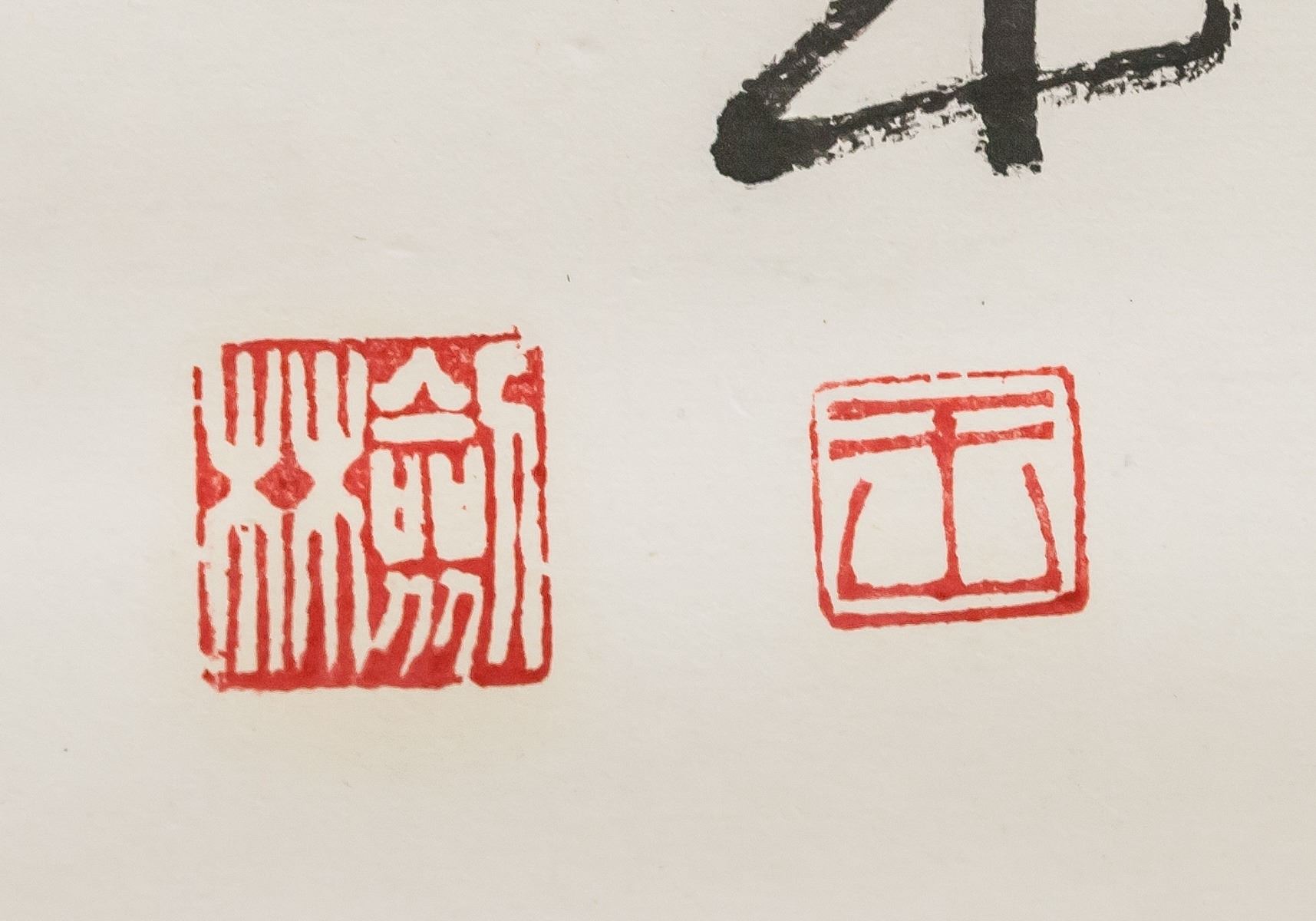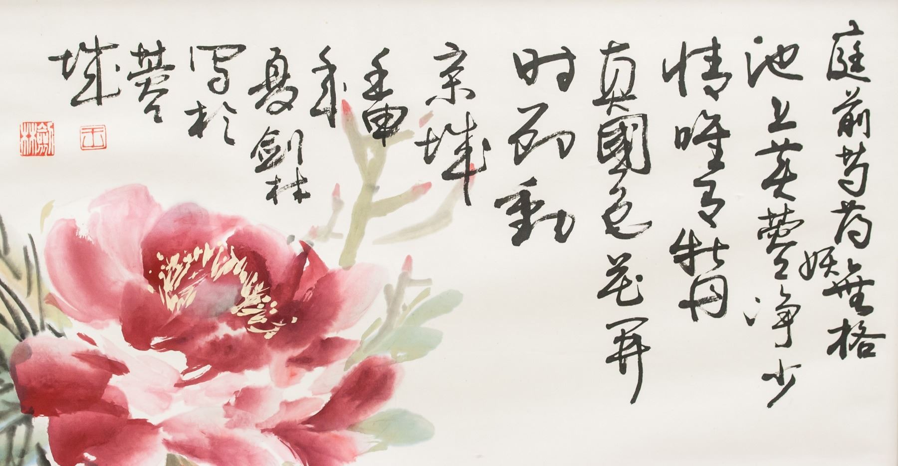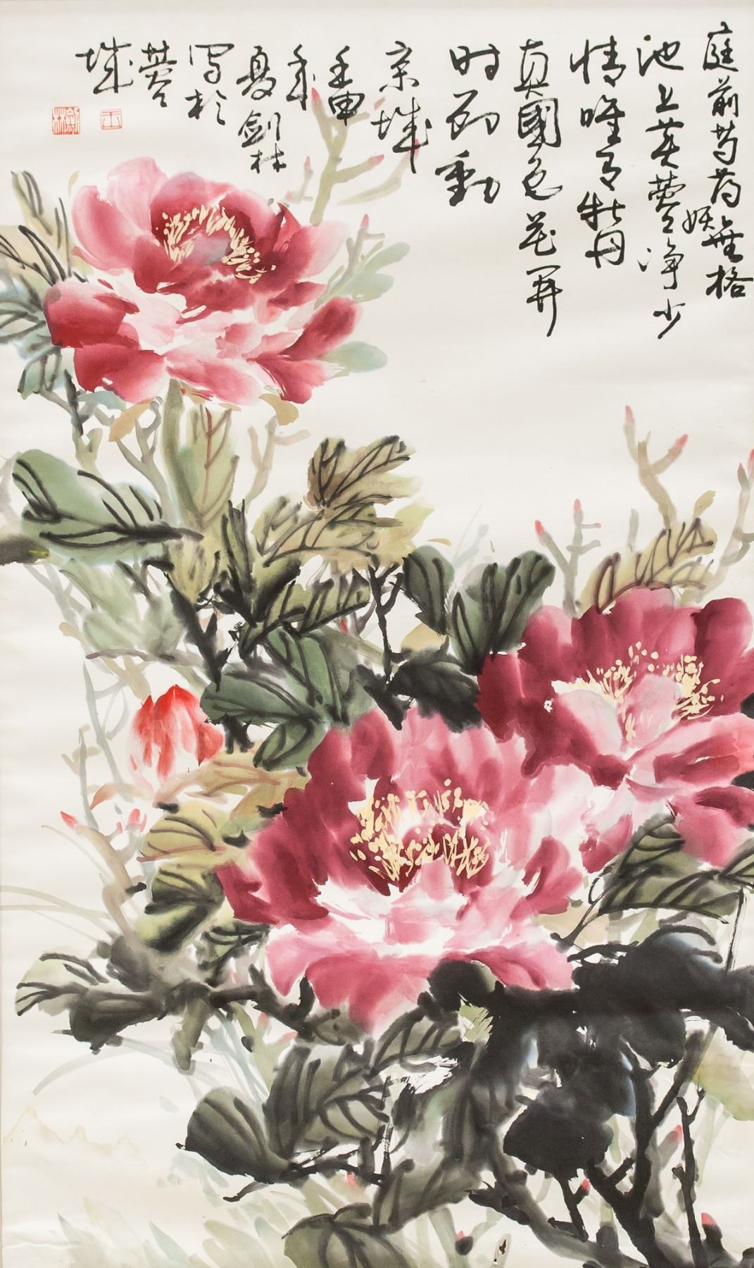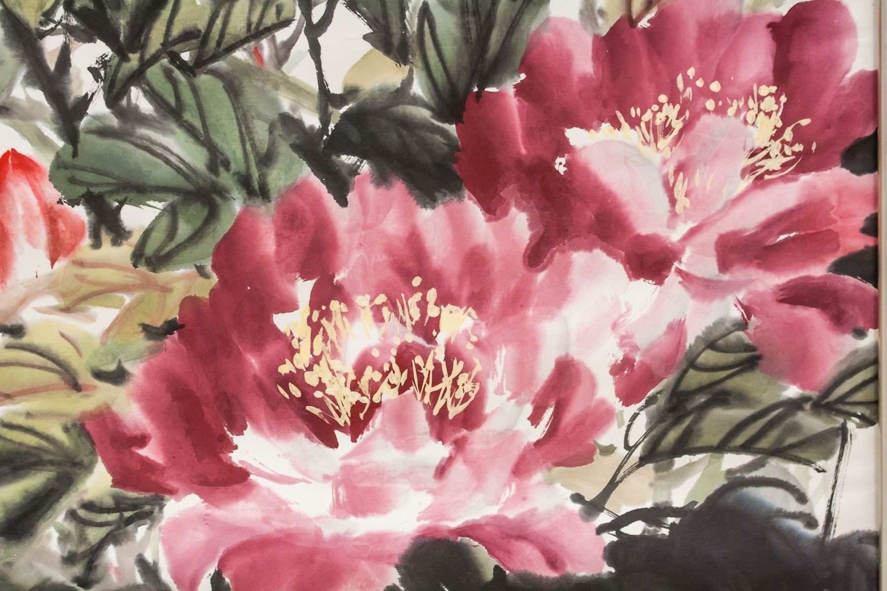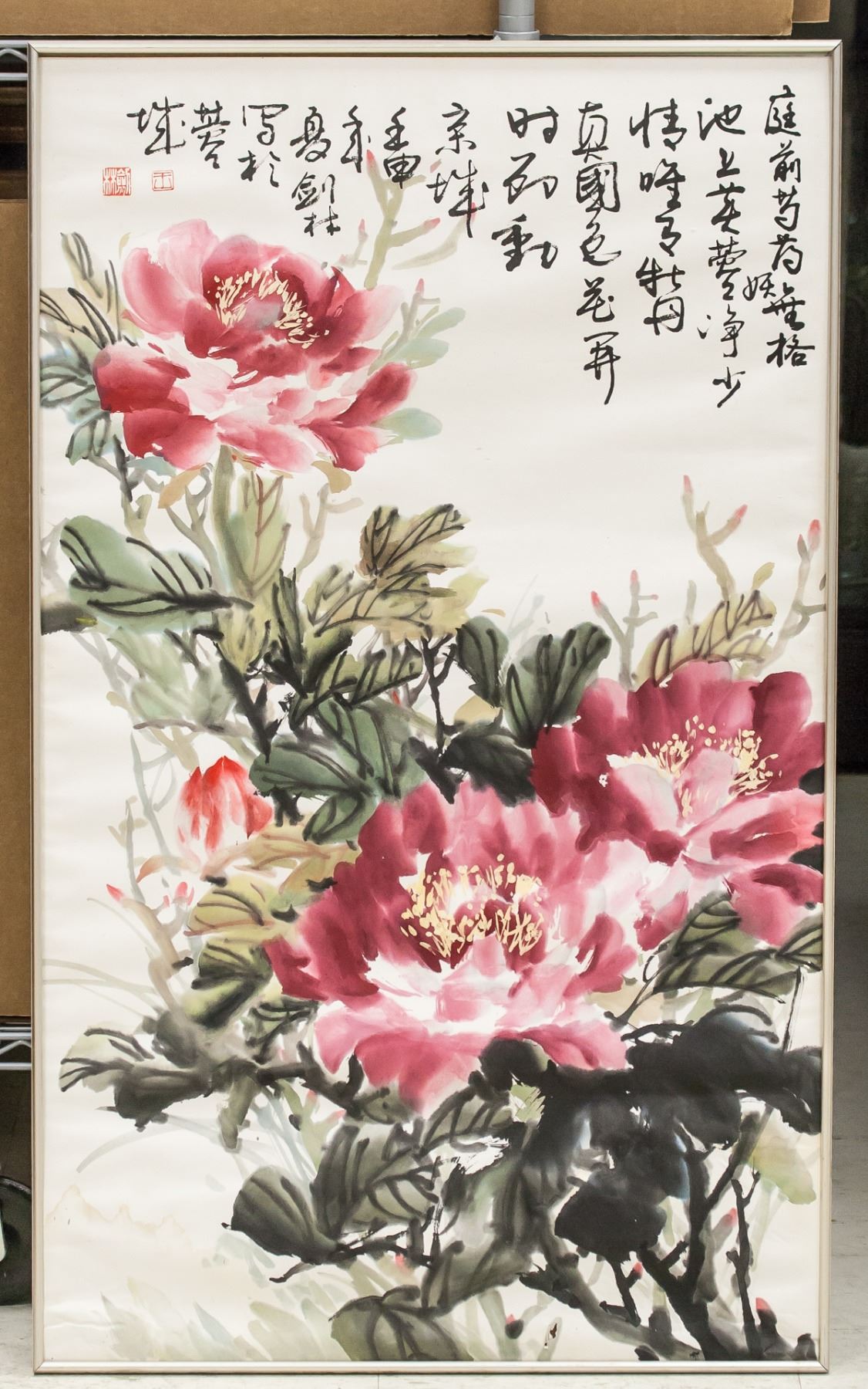 Ink and watercolor on paper, framed. Featuring peonies. Signed Wang Jianlin (20th century, Chinese), inscribed with 2 artist seals. 96 x 58 cm