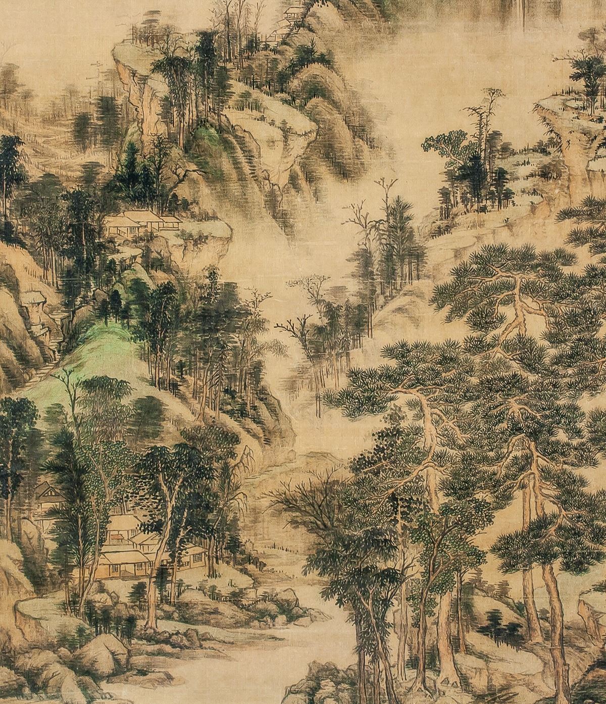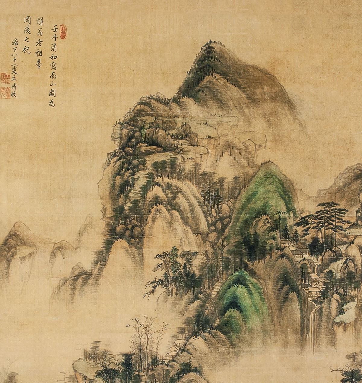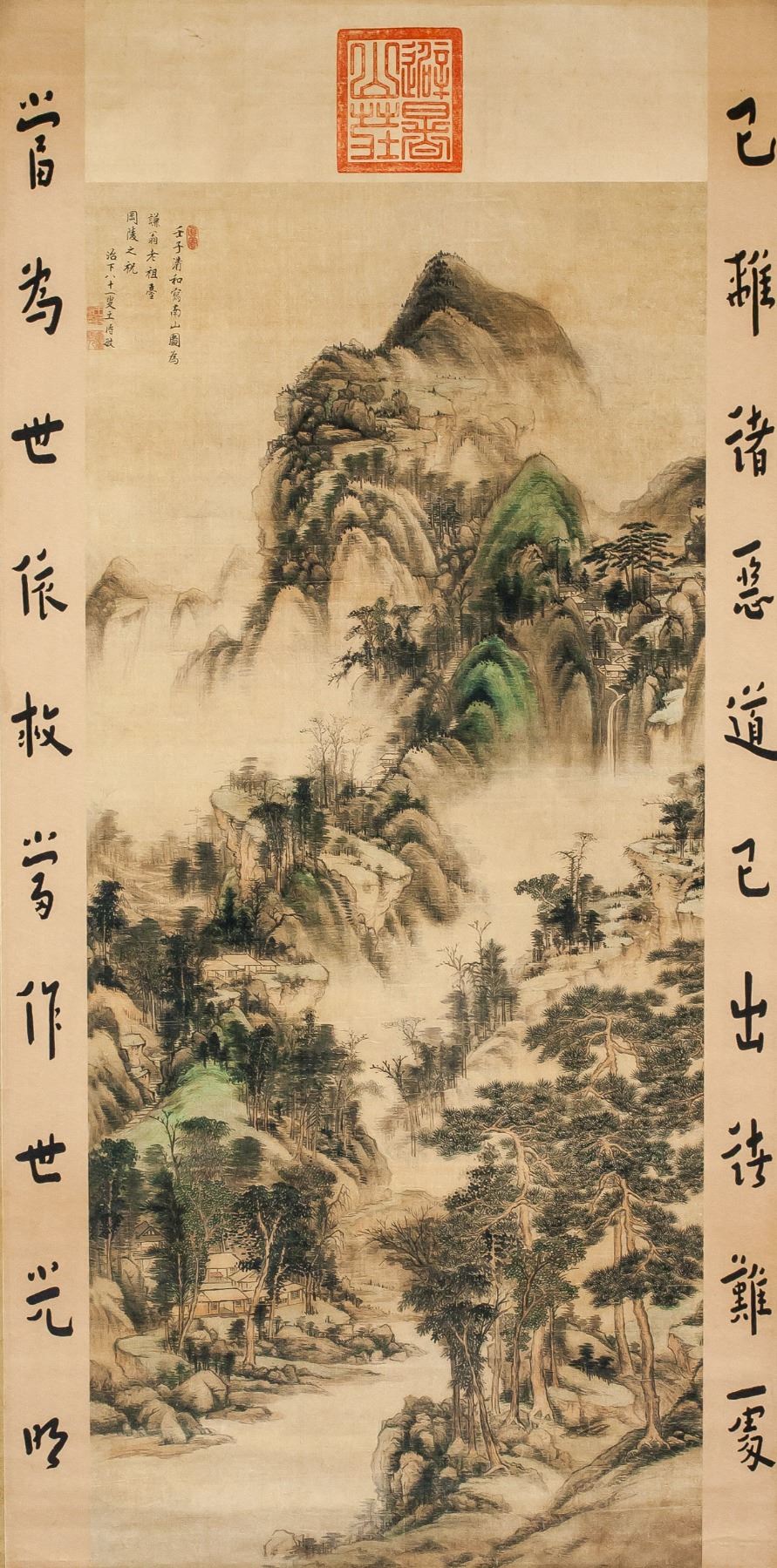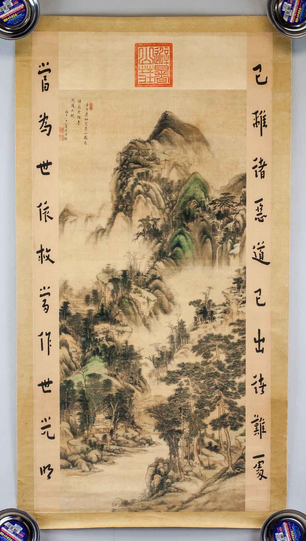 Print on paper roll. Featuring mountainous landscape. Originally painted by Wang Shimin (1592-1680, Chinese). 92 x 44 cm
