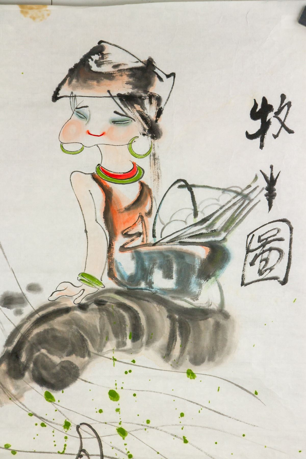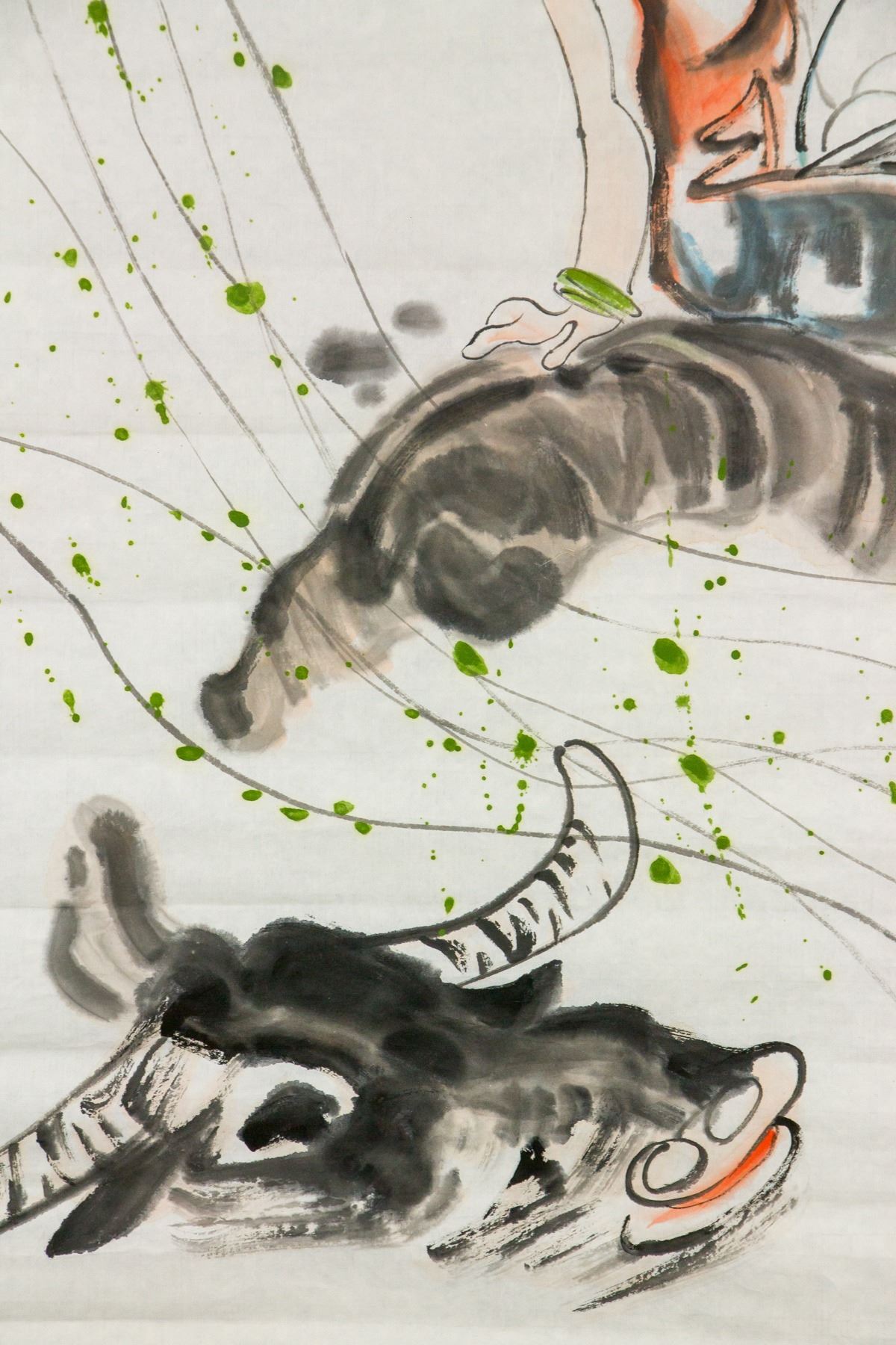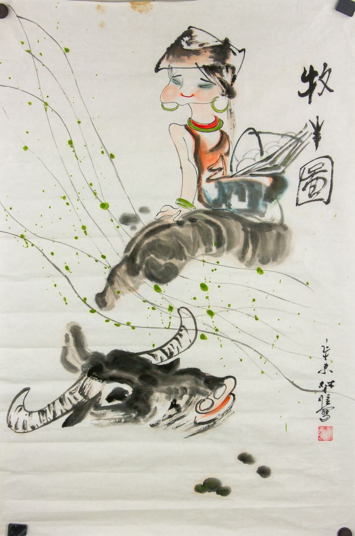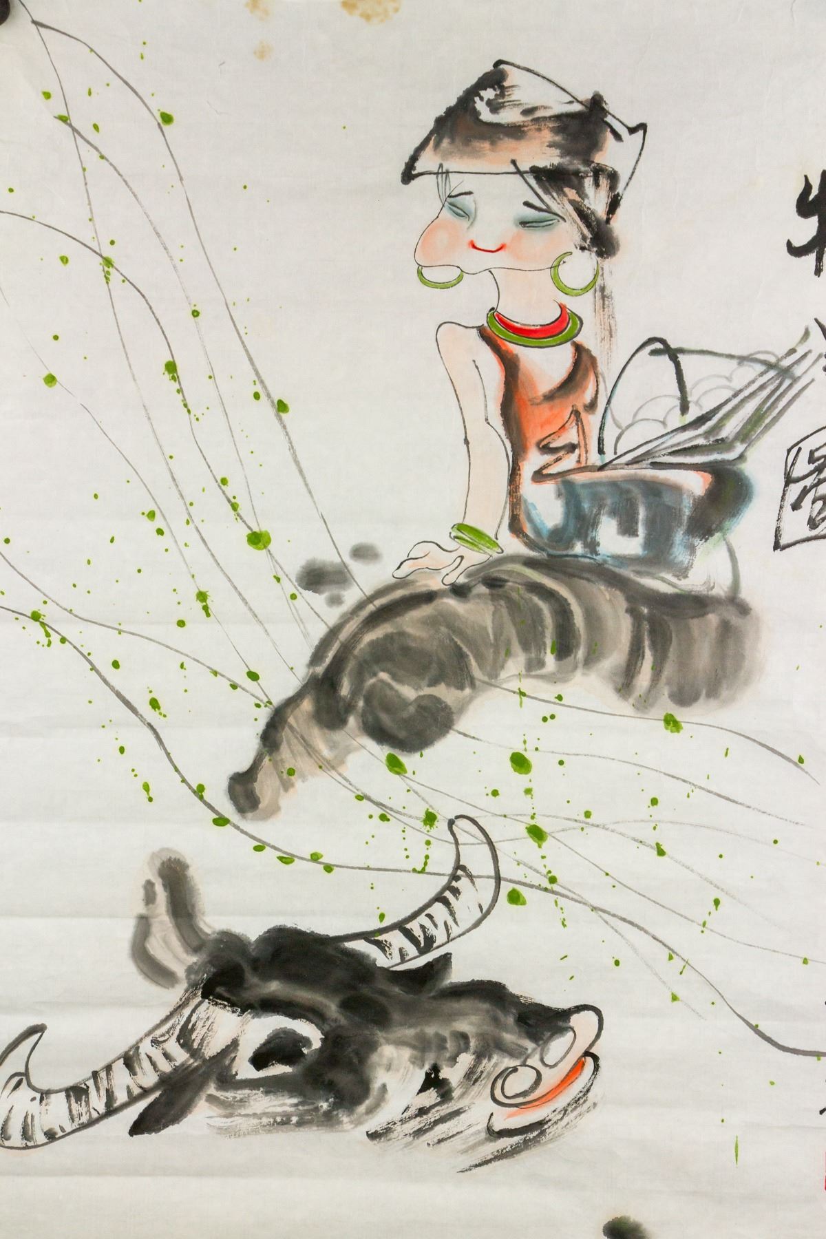 Ink and watercolor on paper, featuring a boy and water buffalo, signed Wang Wei (20th century, Chinese), inscribed with one artist seal, 72 x 49 cm