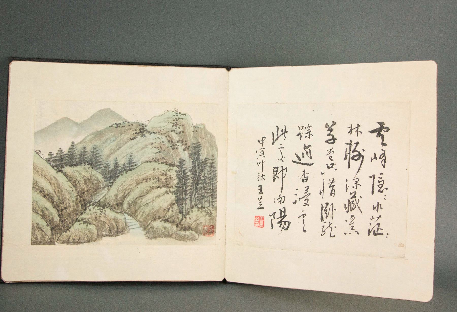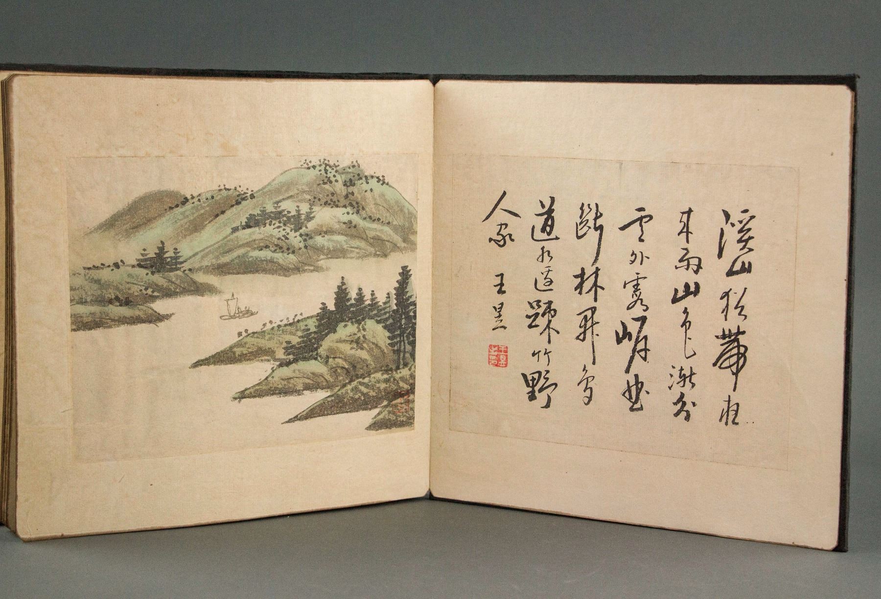 Painting of mountainous landscape with Chinese calligraphy; Chinese ink and watercolour on paper booklet; signed Wang Yu (1662-1748); inscribed with 10 artist seals; 29 cm x 29 cm