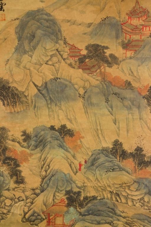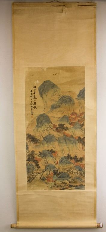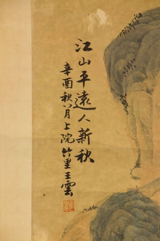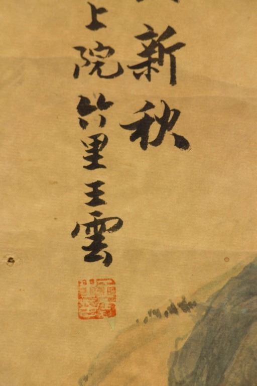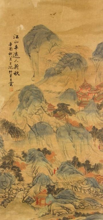 Mountainous landscape with pavilions in early autumn; Chinese ink and watercolour on paper; hanging scroll; signed Wang Yun (1652-1735); inscribed with 1 artist seal; 92 cm x 44 cm