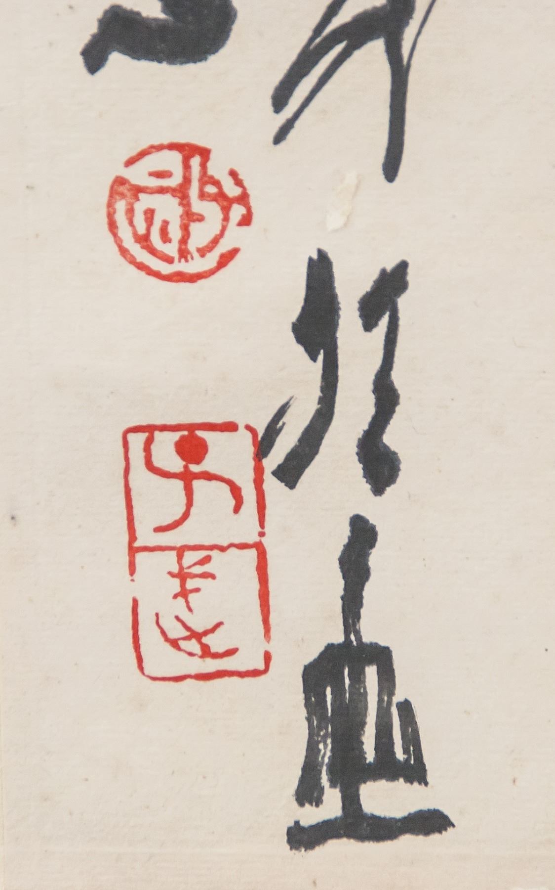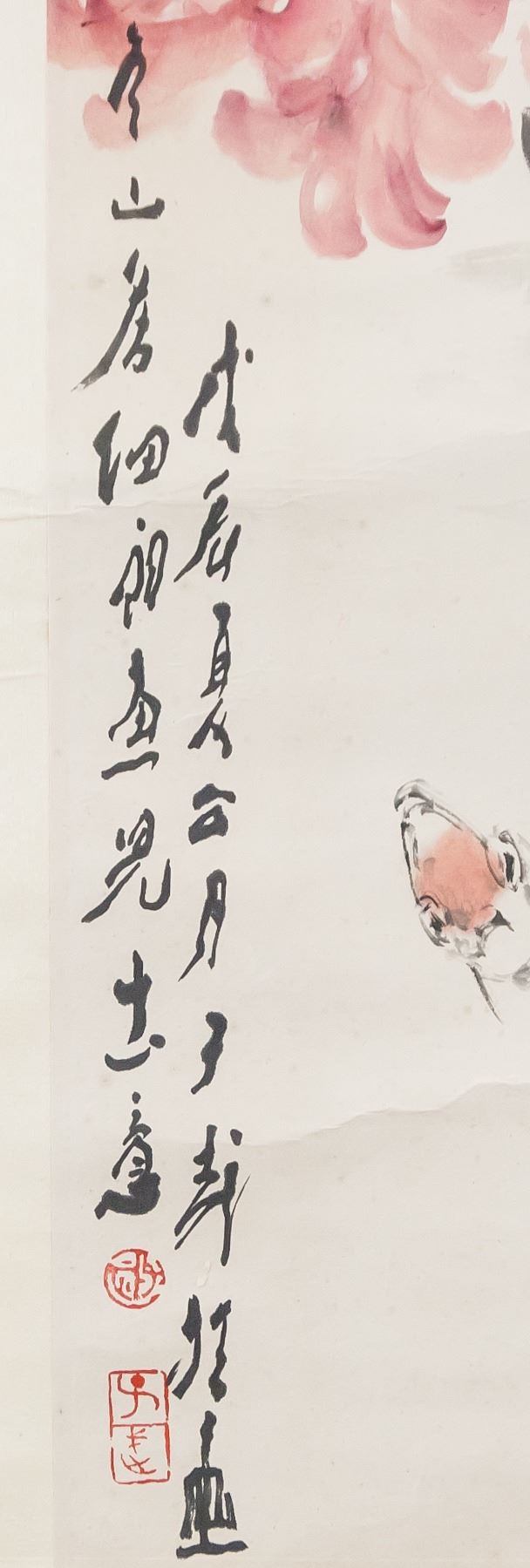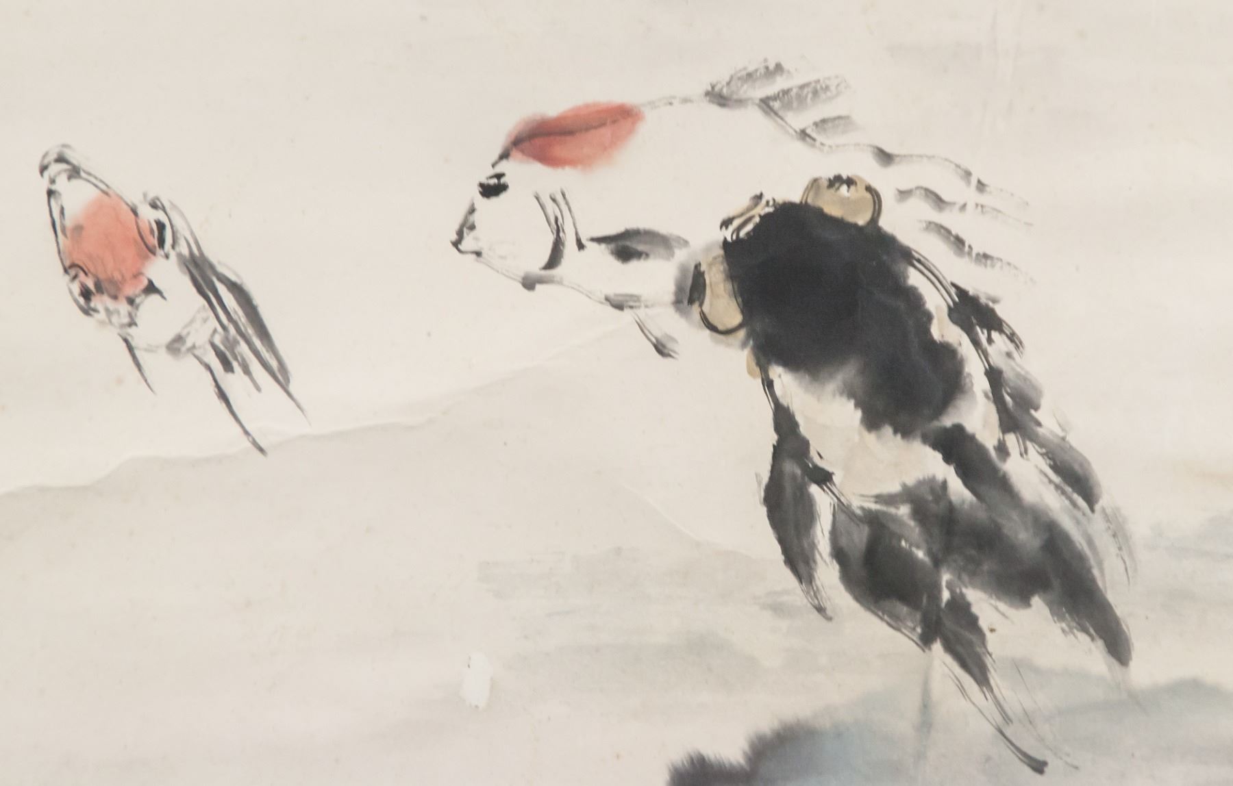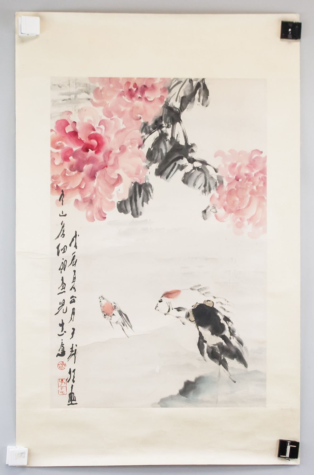 Watercolor on paper roll. Featuring swimming fish and tea flowers. Featuring two artist stamps. Attributed to Wang Ziwu (1936- , Chinese). 67 x 44 cm