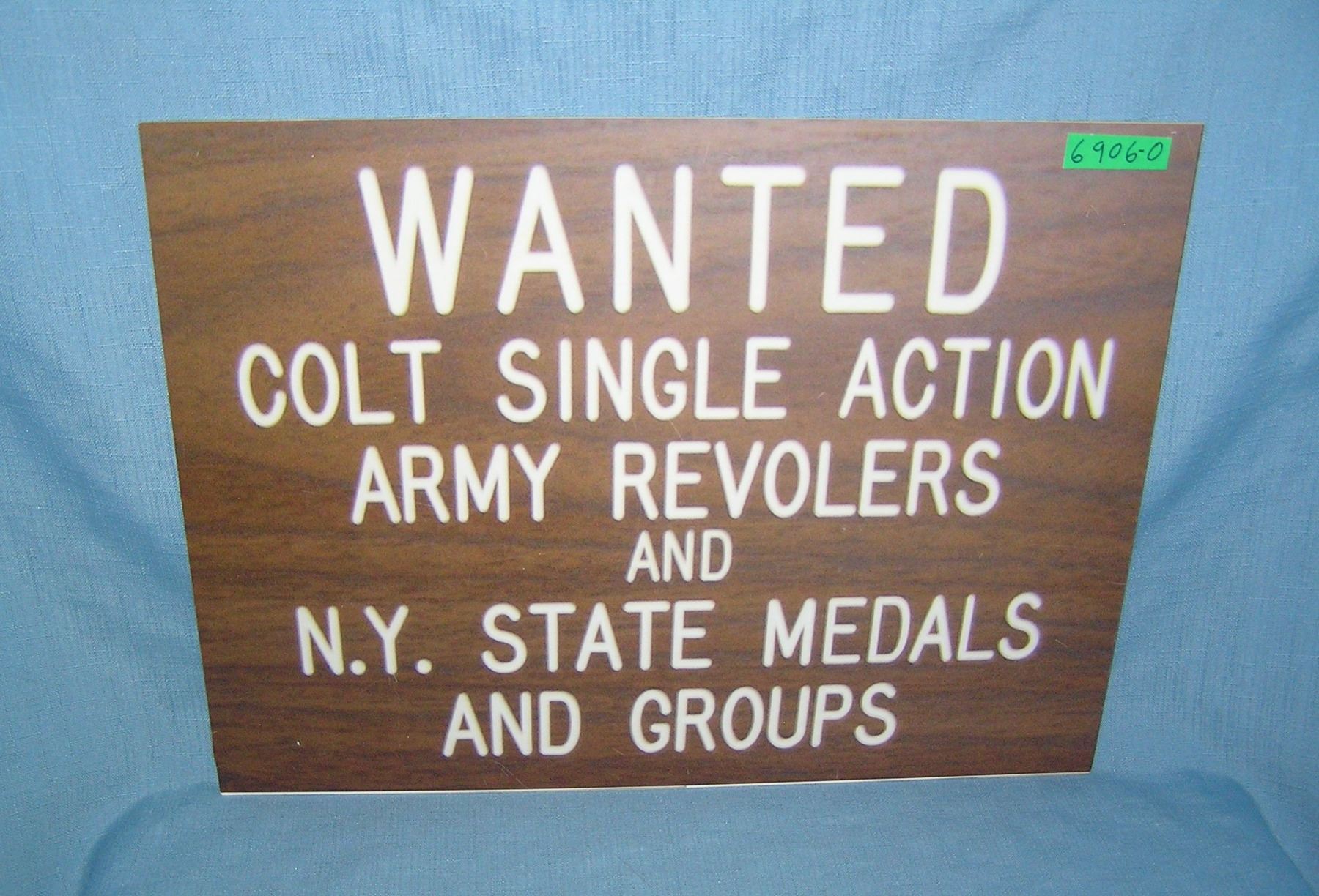 Wanted Colt Single Action army revoluers and NY State Medals and groups retro style advertising sign printed on PVC hardboard these signs are auctioned for their decorative and display purposes 12 inches by 16 inches est. value $50.00-$60.00