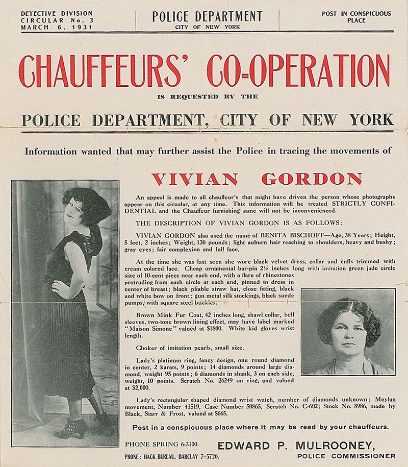 Woman (1891–1931) associated with numerous gangsters who was involved in blackmailing and money lending, found beaten and strangled in a New York park. The investigation that followed became a citywide obsession. Original poster issued requesting information about Vivian Gordon, dated March 6, 1931, 10 x 11.5, featuring two images of her and a description of what she was last seen wearing. In part: “At the time she was last seen she wore black velvet dress, collar and cuffs trimmed with cream colored lace. Cheap ornamental bar pin…with imitation green jade circle size of 10-cent piece.” In very good condition, with intersecting folds and a small tear to the right edge. Gordon had been discovered murdered on February 25, 1931, and this poster was distributed in an effort to trace her movements. Provenance: Eugene Canevari Collection.