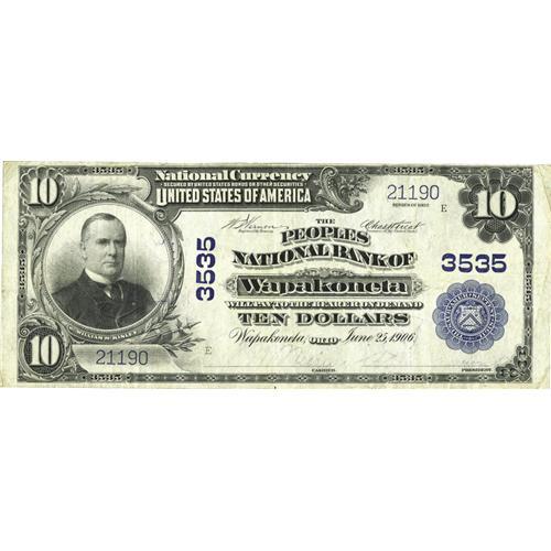 <B>Wapakoneta, OH</B></I> - $10 1902 Plain Back Fr. 626 <B>The Peoples NB</B></I> Ch. # 3535<BR>This <B>Very Fine</B></I> is one of the nicest of the $10 Plain Backs known from here, with most of the others at the low end of the grade spectrum. Our consignor has clearly held this note for some time as it came to us in his holder marked with the price he paid, $55. That long ago level will be surpassed by a considerable margin tonight.