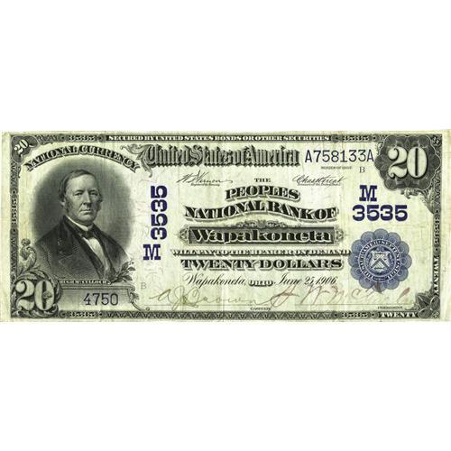 <B>Wapakoneta, OH</B></I> - $20 1902 Date Back Fr. 644 <B>The Peoples NB</B></I> Ch. # (M)3535<BR>Just a single $20 Date Back is know from here, this nicely margined <B>Very Fine</B></I> still displaying the original purple stamped signatures. The scarcity of Date Backs versus their similar in overall appearance Plain Back counterparts is certainly not reflected in current pricing relationships between these two types. We expect that to change in the future as the more ready availability of population information gains wider circulation.