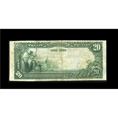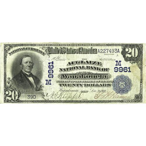 <B>Wapakoneta, OH</B></I> - $20 1902 Date Back Fr. 645 <B>The Auglaize NB</B></I> Ch. # (M)9961<BR>While seven large notes were previously listed in the census from here, not a single one was of the Date Back persuasion. This $20 Date Back displays one ink and one stamped signature, is fully margined all around and retains a considerable degree of crispness and paper body. It merits a strong bid based on its rarity as a denomination and type within the overall census of a bank which is itself not at all readily available.