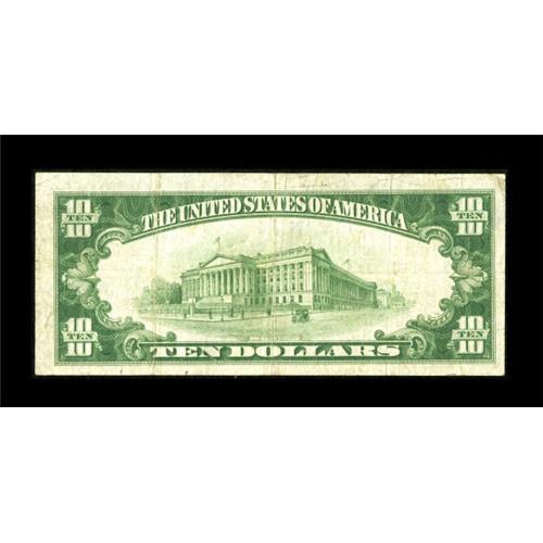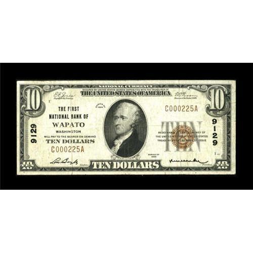 <B>Wapato, WA</B></I> - $10 1929 Ty. 1 <B>The First NB</B></I> Ch. # 9129<BR> This note, from the sole issuer in this Yakima County hamlet, is one of the most exciting pieces to come out of the Kansas City collection. While three other small notes (along with one large) are known from this location, all have been very tightly held for years, with the last offering of any kind coming in a 1986 Hickman and Oakes sale. This example carries the highest grade of any note listed in the census with a grade attached, and is an evenly circulated problem free specimen which any collector would be delighted to own. <B>Very Fine.</B></I><BR><I>From The Kansas City Collection.</B></I><BR><BR><b>Shipping:</b> Coins & Currency (<a target="_blank" href="http://www.heritageauctions.com/common/shipping.php">view shipping information</a>)