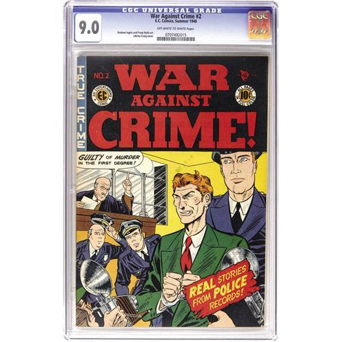 <B>War Against Crime #2 (EC, 1948) CGC VF/NM 9.0 Off-white to white pages.</B></I> We're pleased to offer a high-grade copy of this issue for the first time! EC's contribution to the crime genre was drawn by an intriguing mix of EC regulars like Graham Ingels and cover artist Johnny Craig, and guest artists like Stan ("Johnny Thunder") Aschmeier, Frank Bolle of "Tim Holt" fame, and Iger shop stalwart Lee Ames. Overstreet 2006 VF/NM 9.0 value = $422; NM- 9.2 value = $575. CGC census 5/06: 2 in 9.0, 1 higher. <BR><BR><B>Important notice:</B> Heritage usually auctions material at the rate of 200-250 lots per hour. On some occasions eBay Live bid software or the Internet may not be able to keep up with the pace of the auction. We recommend placing a realistic absentee bid now as insurance to avoid disappointment. Occasionally the auctioneer may eliminate or reject an eBay Live bid, and the auctioneer may also reopen a lot after the close of the eBay live bidding (usually because we missed an audience bid), and may reject your bid even if it shows you as the winning bidder. By bidding via eBay Live, you agree that Heritage may award the lot to another bidder at its sole discretion under the circumstances described above or any other reasonable circumstances. Since eBay bids are not shown to us until we open the lot on the floor, we treat those bids just like floor bids. In most cases the floor responds before the eBay bid is presented to us, due to Internet lag time, so for consistency we have made it a policy that floor bids are always considered first over tie eBay live bids. Also please note that all Heritage lots purchased through eBay Live carry a 22.5% Buyer's Premium. Please make sure you read the Terms and Conditions before you bid. This lot is being auctioned in conjunction with a live floor auction by Heritage Auction Galleries. All final auction and invoice information will be supplied by Heritage Auction Galleries, and all other information should be considered preliminary. Lot:41001 <BR><BR><B>Winning Notification and Billing:</B> After the FINAL session in this auction is complete, Heritage will send e-mail and snail mail invoices. This process normally takes several days. All final auction and invoice information will be supplied by Heritage Auction Galleries, and all other information should be considered preliminary. <BR><BR>This auction will be conducted on a live auction floor and over the Internet through eBay Live. If you choose to place an absentee bid, please take a moment to <font color='#0000ff'><u><a href='http://pages.ebay.com/liveauctions/help/before/laabsentee.html'>learn how eBay Live absentee bidding works</a></u></font><font color='#000000'>