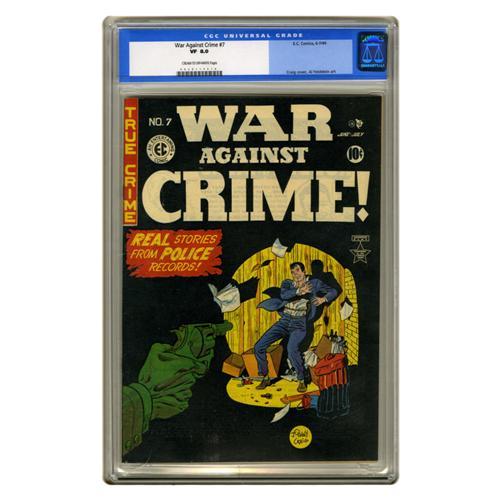 <B>War Against Crime #7 (EC, 1949) CGC VF 8.0 Cream to off-white pages.</B></I> Johnny Craig cover. Al Feldstein art. Overstreet 2006 VF 8.0 value = $239. CGC census 03/06: 1 in 8.0, 2 higher.