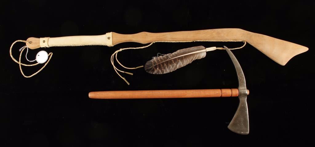Wooden war club with leather wrapped handle with brass tack, braided leather and feather accents-32 1/2" l. Axe has wooden handle with metal head-17 3/4" l with 10" w. axe head.