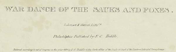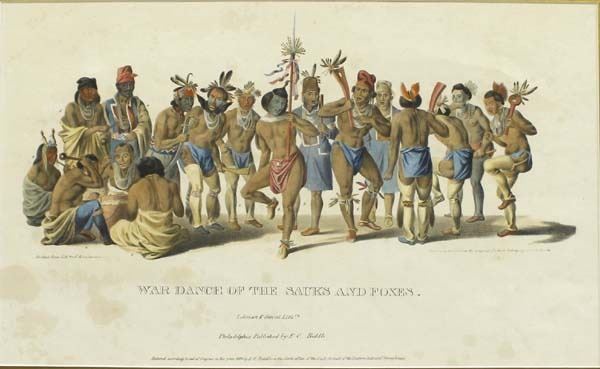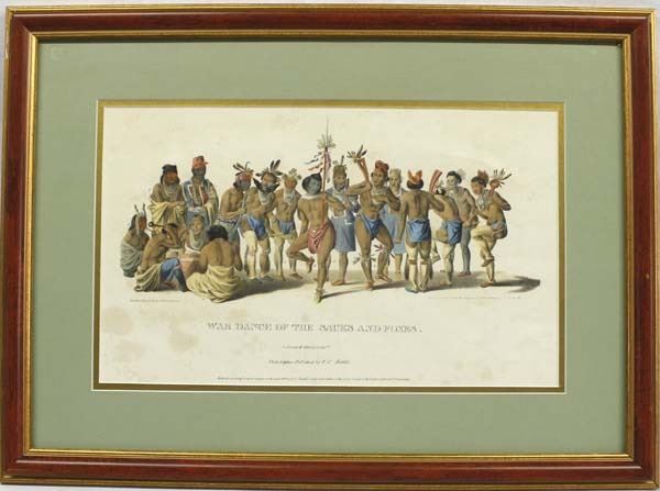 Framed War Dance of the Sauks and Foxes Lithograph based on a painting by Peter Rindisbacher, a Swiss artist who resided in the Red River Settlement established in Winnipeg by Lord Selkirk in 1811, visual measures 10'' x 16'', framed measures 23'' x 17'', double matted, some staining, Lehman & Duval Lith, Philadelphia Published by E.C. Biddle, FYI: ''Peter Stephen Duval, the most prominent Philadelphia lithographer of the 19th-century, was born ca. 1804/5 in France. Duval worked with a large number of partners throughout his long lithographic career beginning with George Lehman in 1834.''