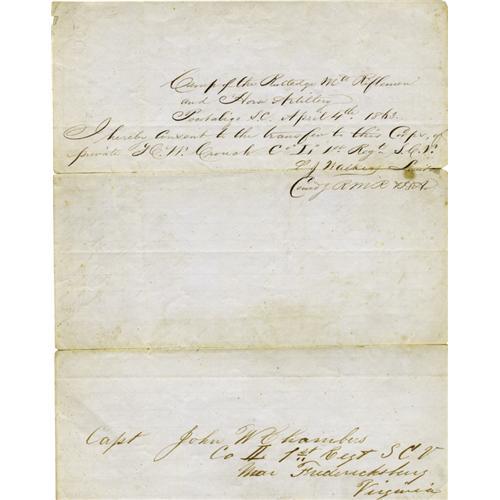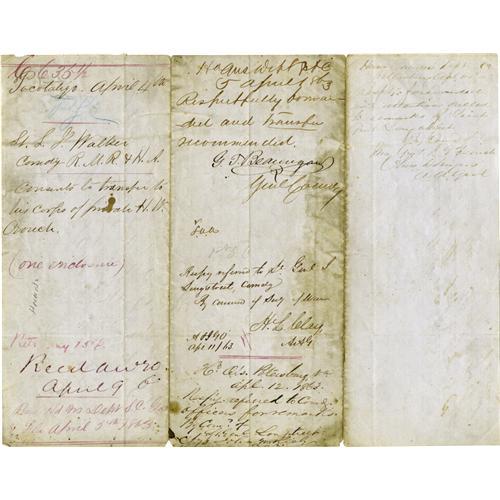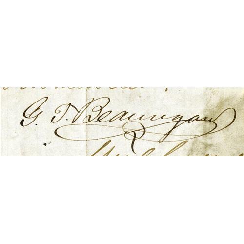 <B>War Date General Beauregard Document Signed,</B></I> "<I>G. T. Beauregard</B></I>". One page with docketing, 7.75" x 9.75", Pocotaligo, South Carolina, April 4, 1863. Written by a Lieutenant L.J. Walker in the "<I>Camp of the Rutledge Mtd Riflemen and Horse Artillery</B></I>", this item requests the transfer of Private H.W. Crouch, Company "I", 1st SC Volunteers to Longstreet's Corps. This seemingly modest piece of business generated numerous dated endorsements on the document's verso. Among those approving Private Crouch's transfer were General P.G. T. Beauregard, then commanding Confederate forces in South Carolina, Georgia and Florida. Moderate soiling, large splits on folds. Beauregard's signature is prominent on the middle panel and is quite legible. Overall good condition.<BR><BR><b>Shipping:</b> Small Flat (<a target="_blank" href="http://www.heritageauctions.com/common/shipping.php">view shipping information</a>)