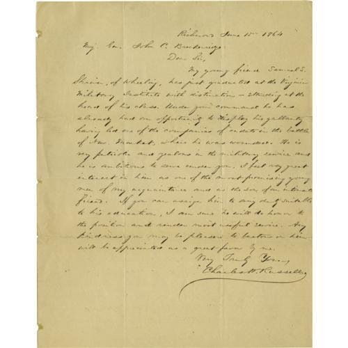 <B>Fine War-Dated Letter to General John C. Breckinridge</B></I> recommending a V.M.I. cadet who fought at New Market. Charles W. Russell writes from Richmond, June 15, 1864, to commend one Samuel S. Shriver of Wheeling to the former U.S. vice president turned Rebel leader. Measures 8" x 10" with outstanding display appearance.<BR><BR><b>Shipping:</b> Small Flat (<a target="_blank" href="http://www.heritageauctions.com/common/shipping.php">view shipping information</a>)
